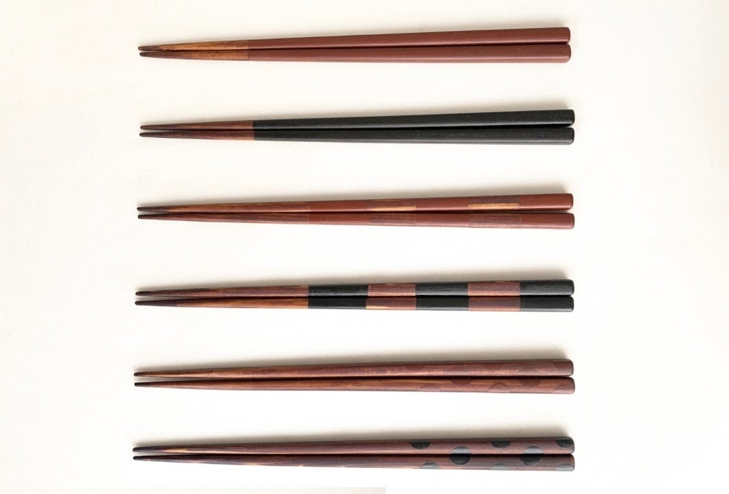日本産漆、天然素材だけで仕上げた暮らしにも環境にも優しいお箸。家族のための食器も道具も安全安心なものをとこだわる那美子さんが、日本産漆を身近に感じてほしいと作りました。漆は抗菌性のある自然由来の防水塗料。熱にも強く、安心で気持ちよく使えます。能登ヒバの箸木地に漆を1本ずつ摺り込んで作る、心温まる使いやすいお箸です。