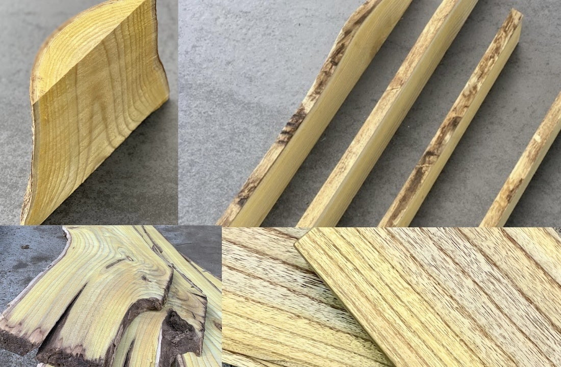 商品開発・試作の過程でウルシ木材の端材が発生します。木工専門の方も手にする機会の少ない希少なウルシ木材に実際に触れて、活かしていただけたら嬉しいです。端材なので形も大きさも色々で、中には漆掻きの跡が残っているものや、節があるものもあります。それぞれが木が生きた証です。いろいろな部位を組み合わせてお送りします。