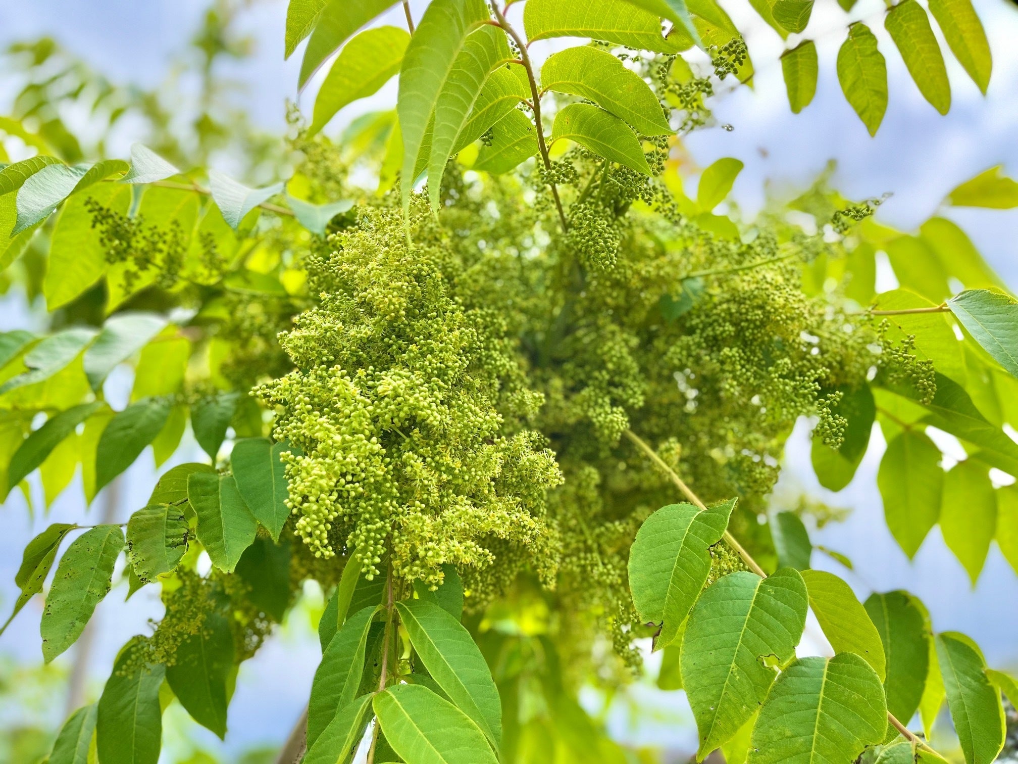 初夏に咲くウルシの花 芳しい香りにミツバチが集まります