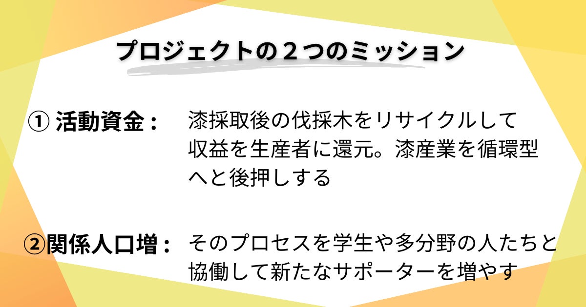 ウルシの木と漆の魅力に多くの方に気づいてもらうための「アンバサダー商品」を作ること、それを継続していくための体制を作っていくことです。