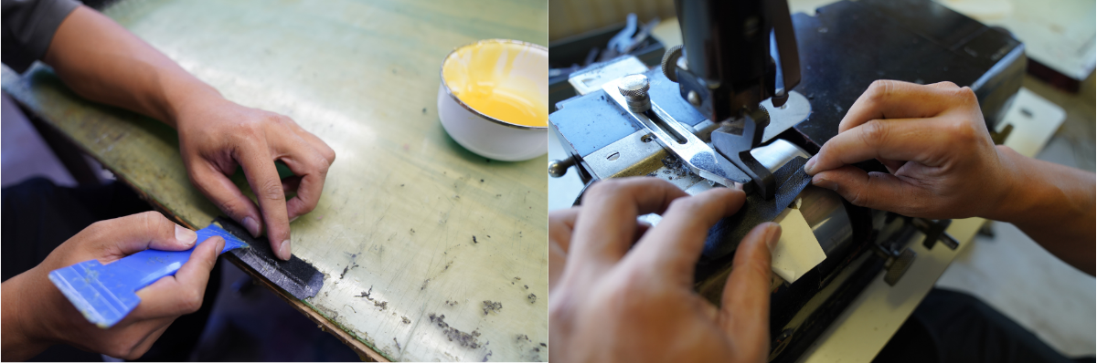 1枚1枚厚さを測りながら、模様が美しく残るよう仕上げていき、全てヘリ返しをすることで、強度にもこだわった作りにしています。