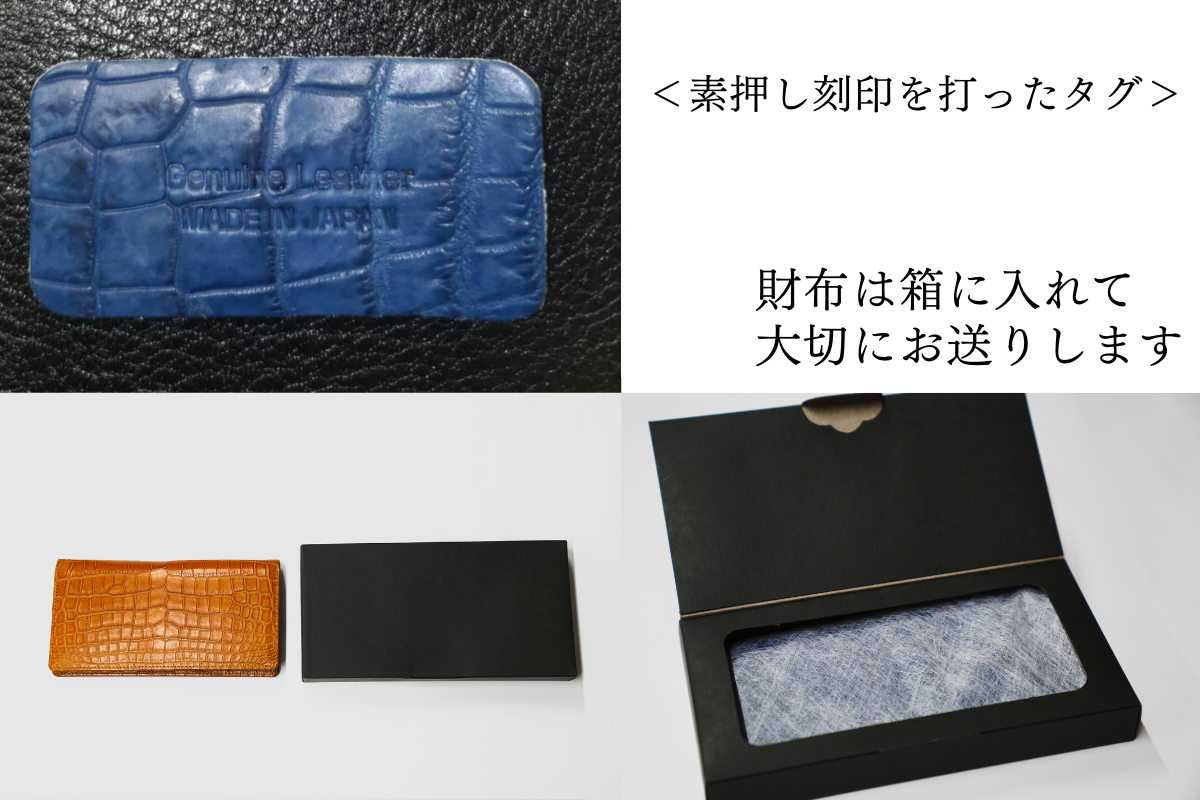 長財布にはmade in japanの刻印を素押しで打ったタグをお入れし、箱にいれてお届けします。