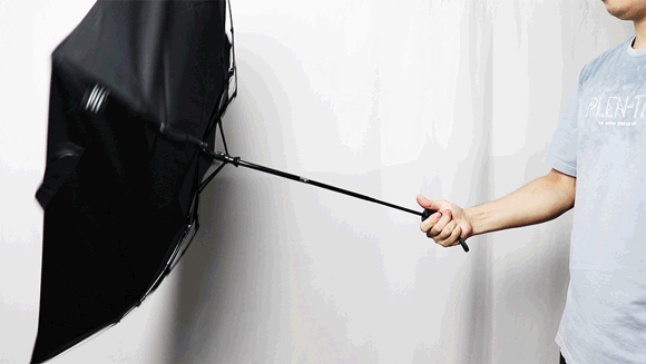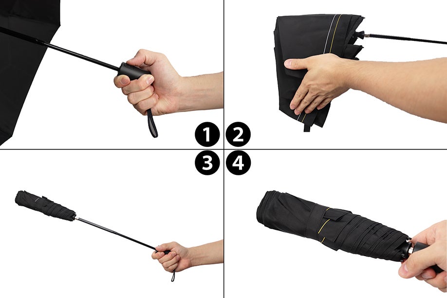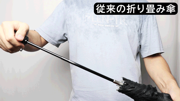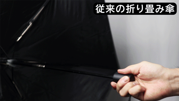 従来の折り畳み傘は収納時に生地の折りすじに沿って折り畳んで収納するのが一般的で、手間と時間がかかります。