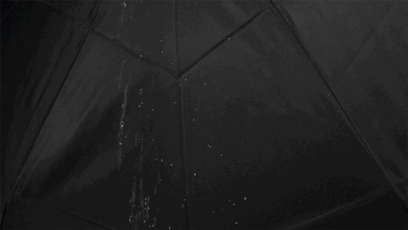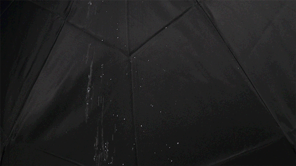 大きい水滴が傘に落ちた瞬間に水玉になって滑り落ち、小さい水滴は軽すぎるので一時的に表面に付着しますが、軽く振るだけできれいになり、即収納ができます。