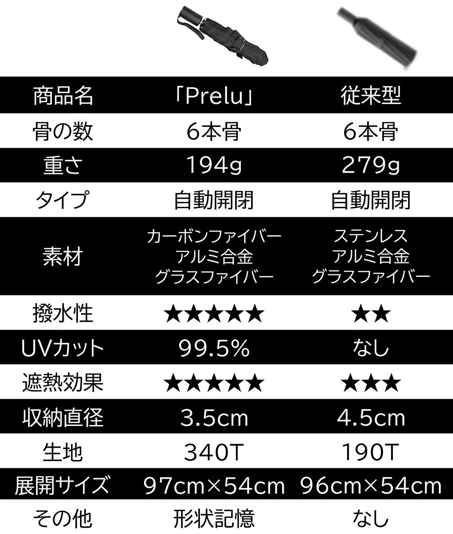 「Prelu」は形状記憶の加工を採用し、畳んで収納する時間と手間を減らし、きれいに収納できる折りたたみ傘です。同時に、安全な飛び出し防止機能が搭載され、子供でも安心して使えます。さらにUVカット、超撥水、超軽量、カーボンファイバーなどの特徴を合わせ、一年中欠かせないアイテムです。