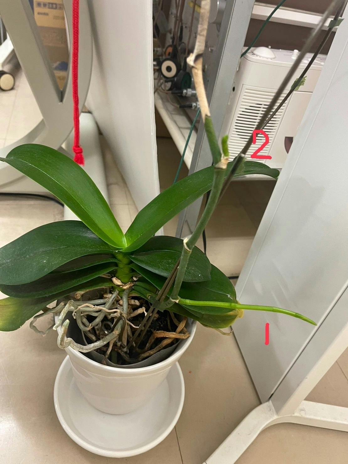 後しばらくで、①長い花茎からは蕾ができ