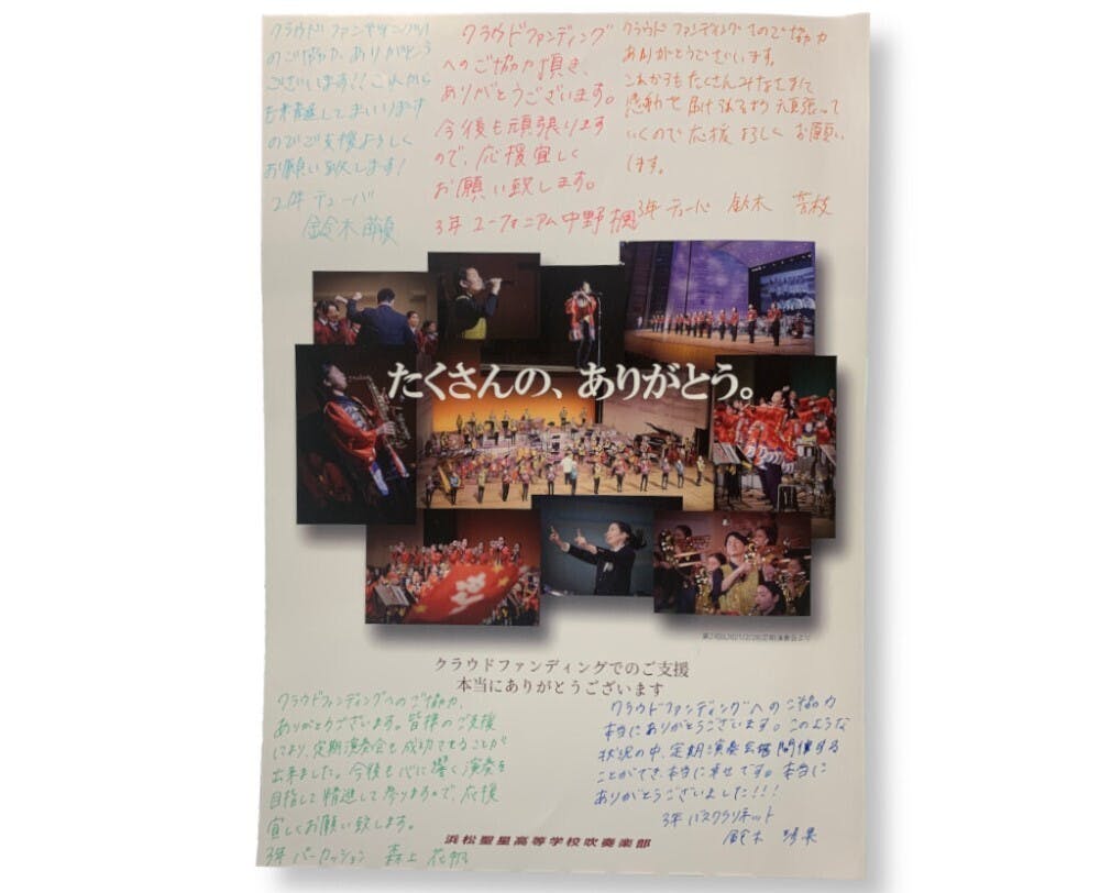 そして、このプロジェクトを通して「私たちはこんなにも多くの方に応援していただいているのだ」という事を部員一人一人が自覚し、それに応える演奏をする気持ちを再確認したいと思っています。