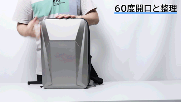 通常は60度開口で、両側には手軽に開け閉めできるマジックテープがついており、開けるとスーツケースのように180度展開が可能です。