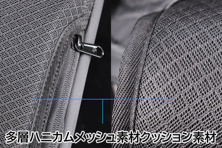 リュックの後ろとショルダーハーネスには厚めの柔らかなクッション素材と多層ハニカムメッシュ素材から構成され、衝撃を吸収して分散させる効果があります。