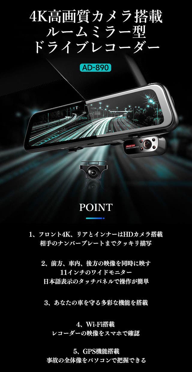 【AD-890】はルームミラー型のフロント4K高画質ドライブレコーダーです。