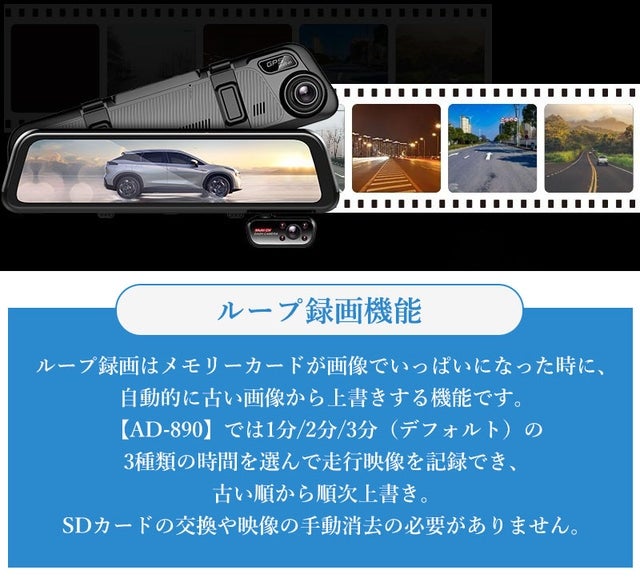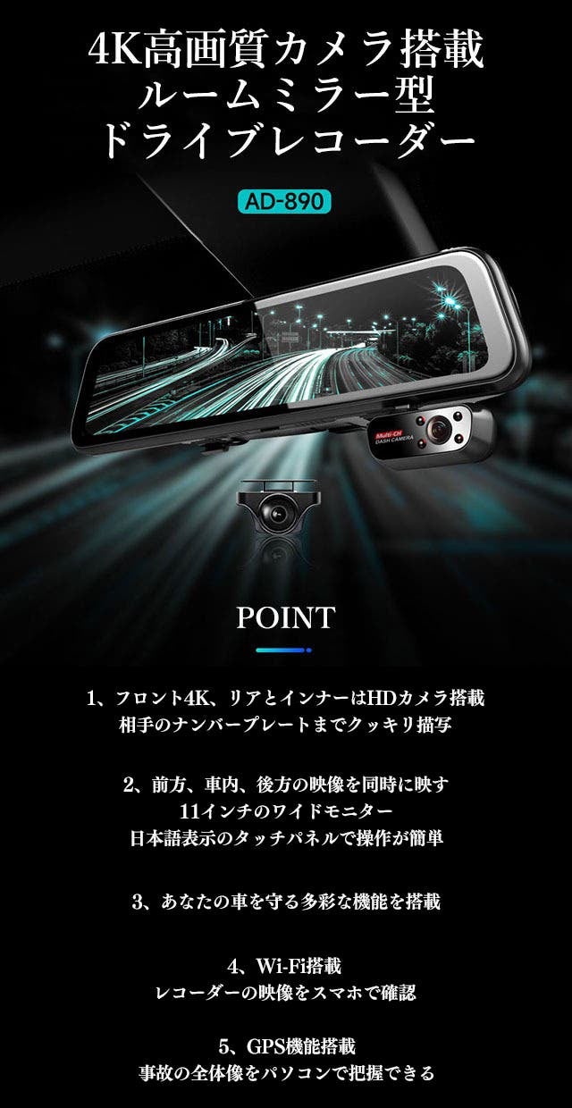 【AD-890】はフロント4K高画質カメラを搭載したルームミラー型のドライブレコーダーです。
