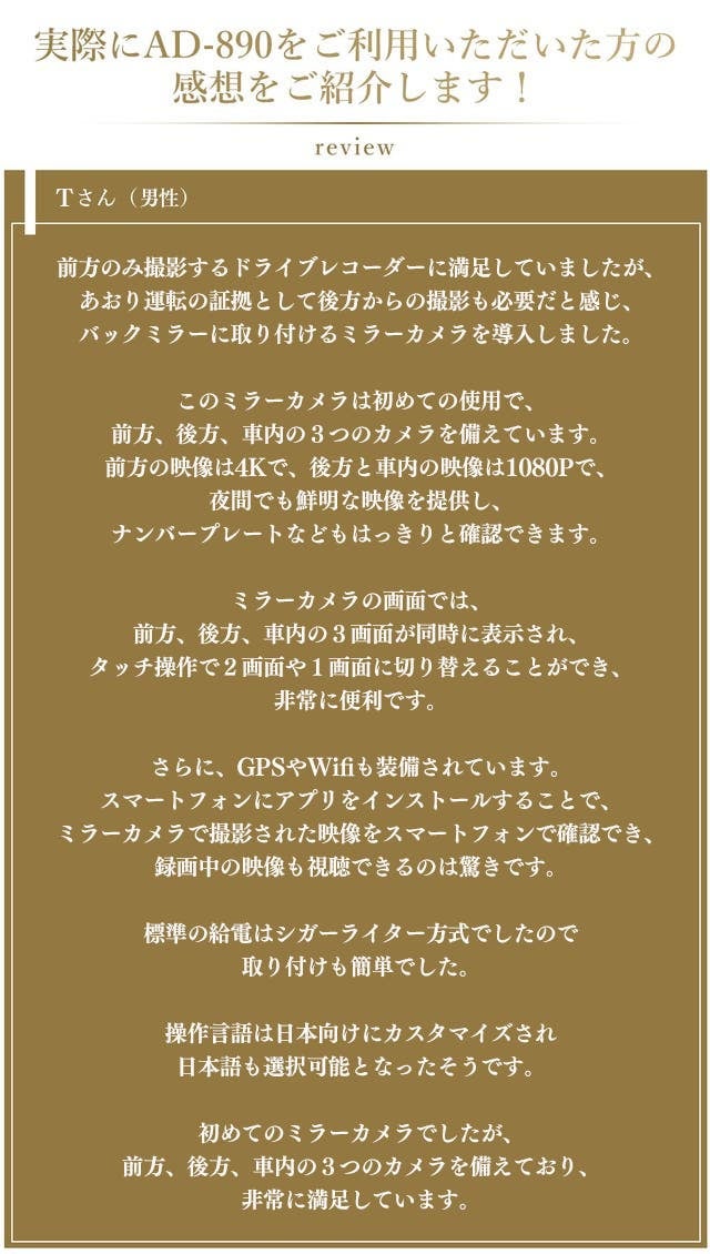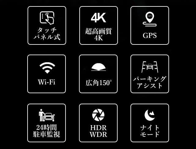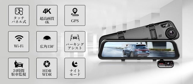 ミラーカメラといってもたくさんありますが、フロント4K、リヤ・インナー1080Pの解像度、Wi-Fi機能付き、スマホ連携し画像確認が可能、さらに日本語言語機能が搭載されたミラーカメラをとても気に入っています。