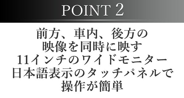 11インチのワイドモニターで前方、車内、後方の3つの映像を同時に一つの画面に反映。