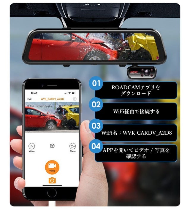 そのほか、このミラーカメラはWi-Fiを搭載しているのも大きな特徴です。スマホに専用アプリをインストールしミラーカメラのWi-Fiと紐づけすると、ミラーカメラ内のマイクロSDカードに自動保存した映像がスマホでも確認ができる嬉しい機能がとても気に入っています。ミラーカメラ内に収めるマイクロSDカードは別売りですが、マイクロSDの容量は最小8GBから最大256MBまで対応し、映像保存も可能です。