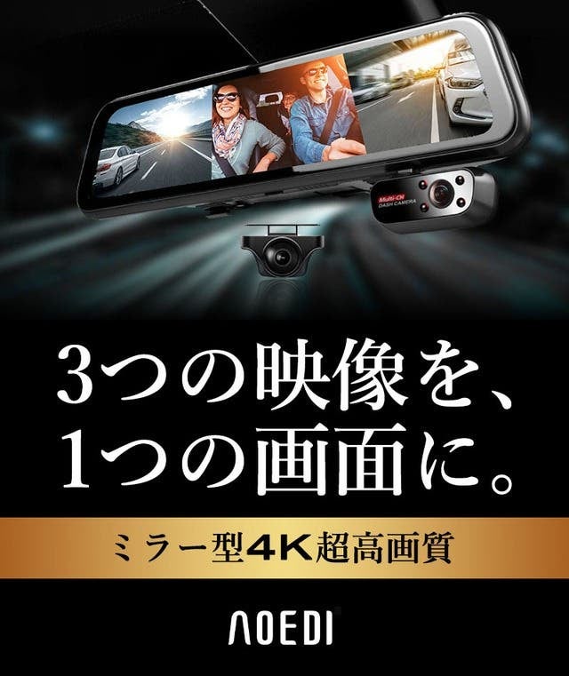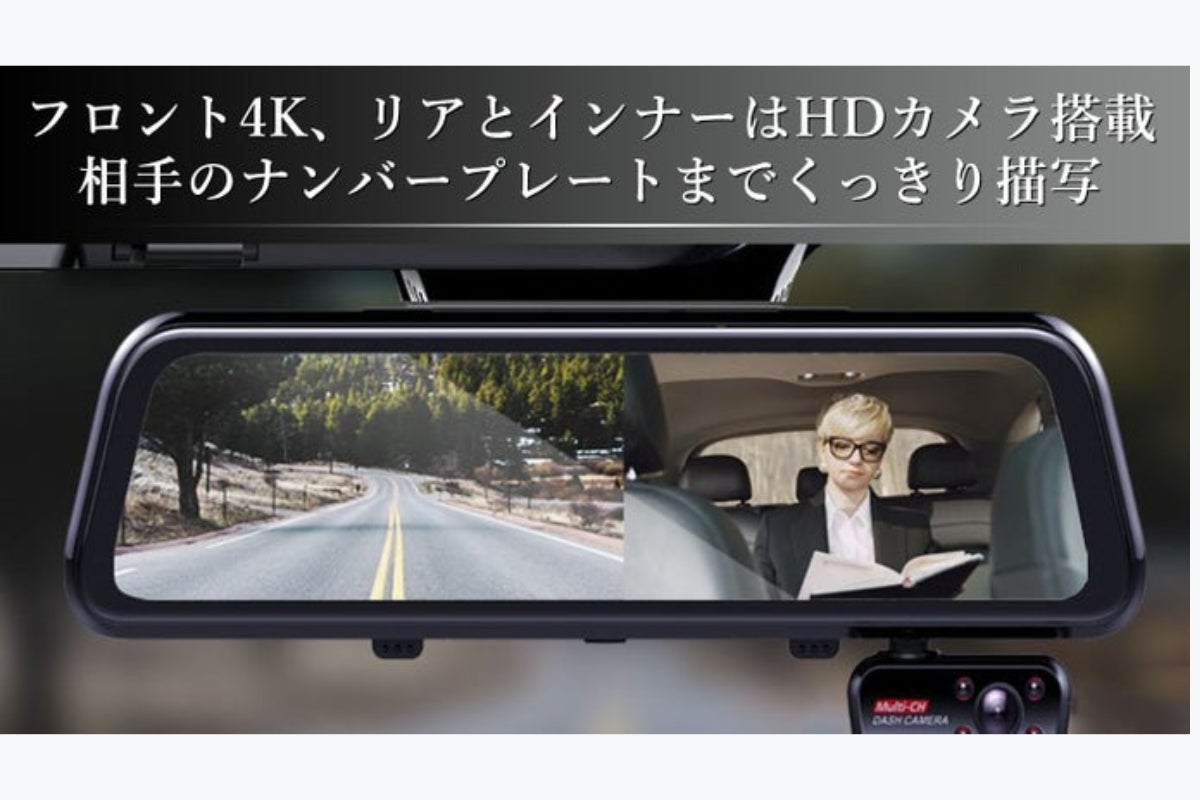 ①超高画質フロント4Kのミラー型ドライブレコーダー。前方、車内、後方を1つの画面に3分割で映す