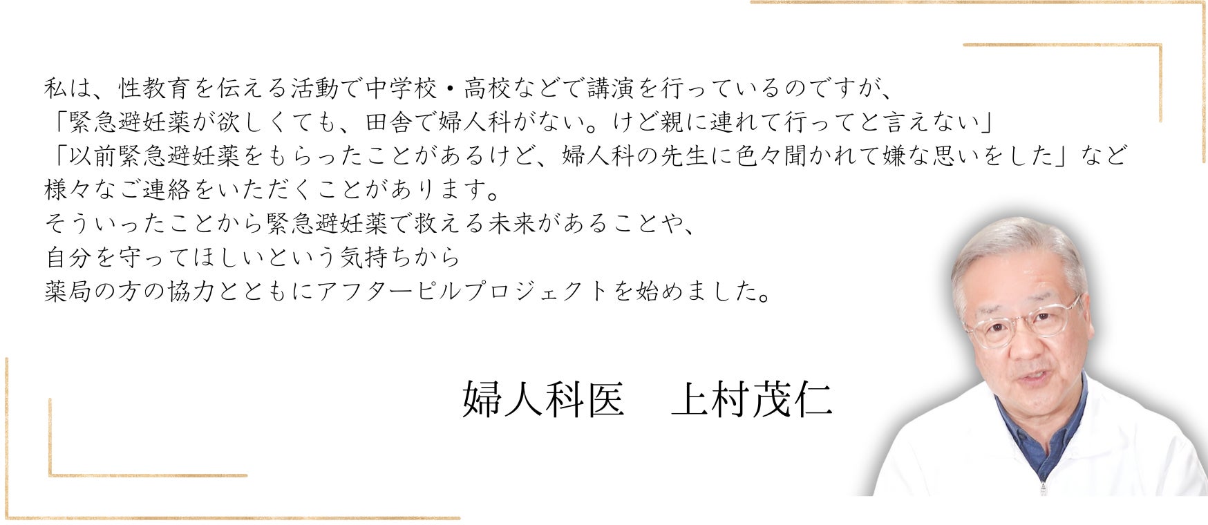 また、緊急避妊薬のOTC化(医師の処方箋がなくても薬局などで購入が可能)に向けての啓蒙と準備も行っております。