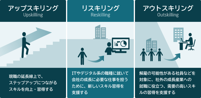 「リスキリング」とは、次世代の働き方に向けて新しいスキルを身につけることです。スキルを習得することで既存の業務から少しずつ離れ、今までとは別の業務に就くことを目標にし、国も支援している取り組みで、「学び直し」とも言われます。