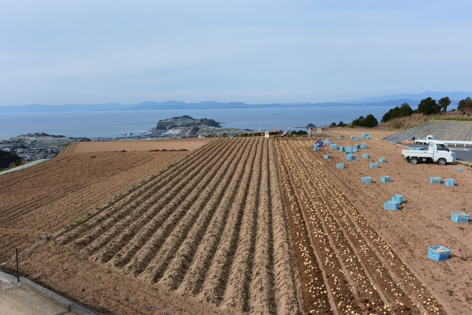 長崎県は全国でも有数のじゃがいもの産地ですが、その中でも私たちが住む雲仙市南串山町は海に面して段々畑が広がっており、豊富な栄養を持つ土で水はけがよく、温暖な気候と太陽の恵みを効率よく受けることができる、じゃがいもを作る最高の環境なんです。