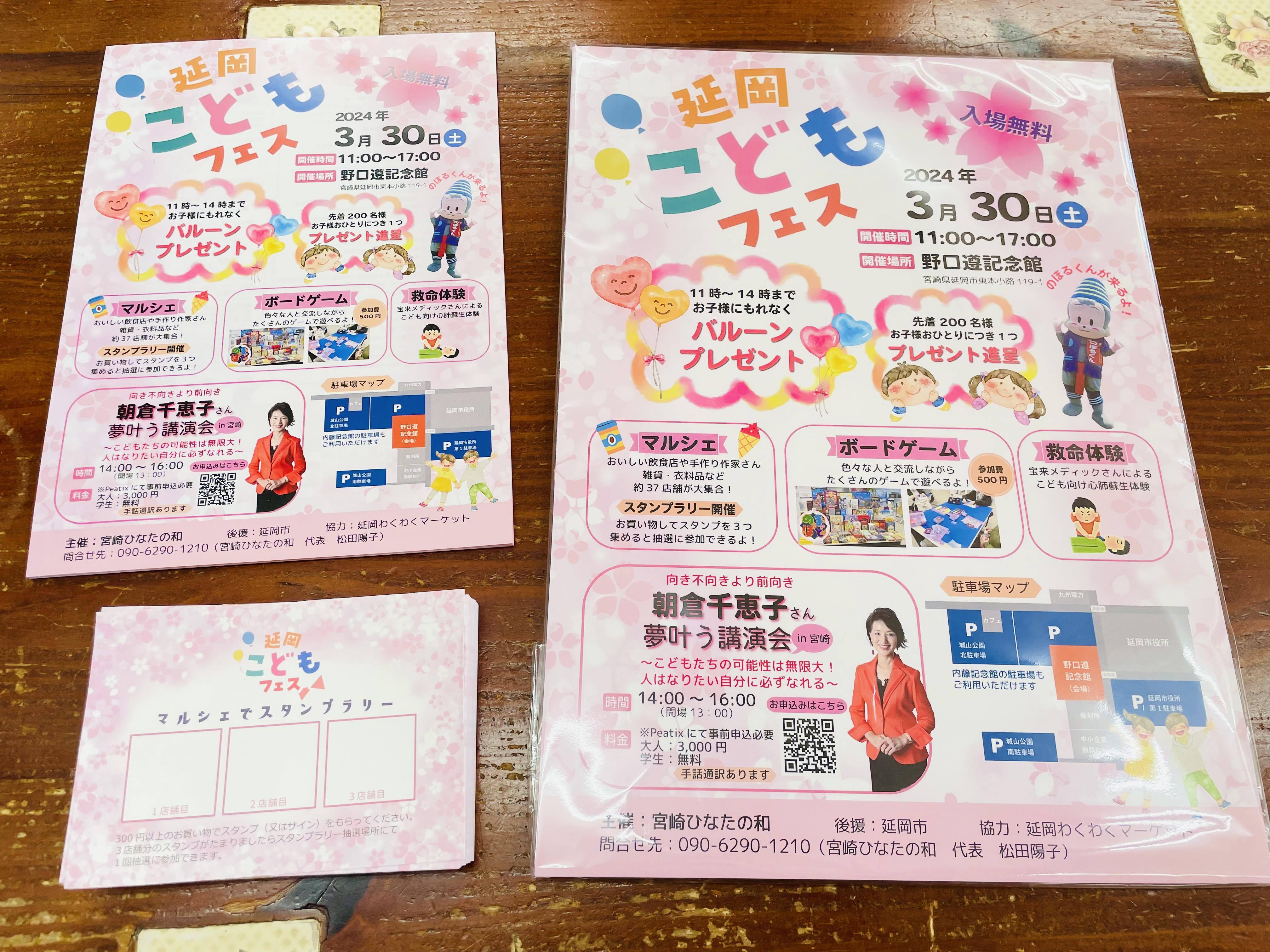 3月30日が近づき、延岡こどもフェスのポスターやチラシ、スタンプラリーのカードが届きました(^^)