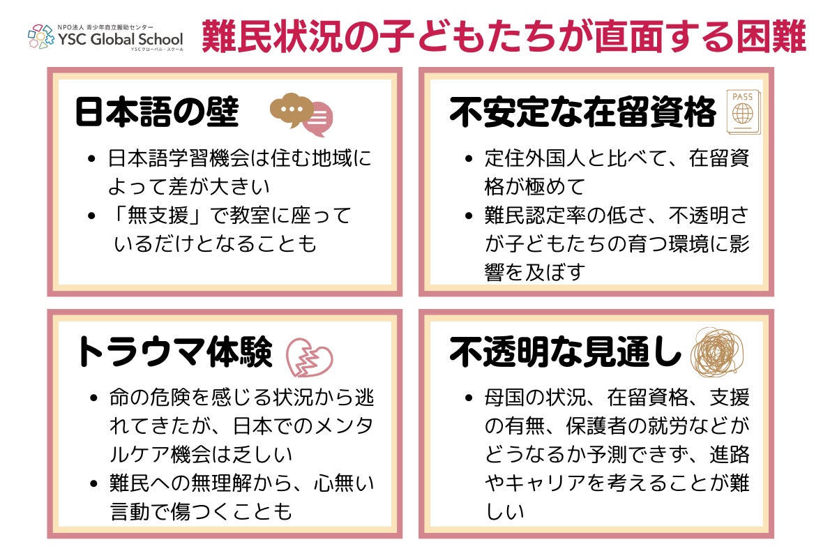 2023/12/25 12:00こんにちは!NPO法人青少年自立援助センターYSCグローバル・スクールの田中宝紀です。難民状況の子どもたちのために、安心して学べる機会を提供するためのクラウドファンディング、12月22日、無事目標金額を達成することができました!最終的に150名の方々より、1,039,800円のご支援をいただきました。ご寄付は、全額子どもたちの教育のために大切に活用させていただきます。また、SNS等での情報拡散、ご友人のご紹介などご協力くださった皆様を含め、私たちの取り組みを応援していただいているすべての皆様へ、改めまして、心より御礼申し上げます。そして、今回のクラウドファンディングのために準備や新着情報記事の執筆、SNSでの発信などを担ってくれた広報チームメンバーや、日々、現場で子どもたちと向き合い、安心と学びを届けている日本語教師や学習支援担当、多文化コーディネーターなどの支援スタッフにも感謝の気持ちでいっぱいです。「海外ルーツの子どもって、どんな子ども?」昨年度よりウクライナ避難民の子どもたちの出会いを皮切りに、様々なルーツを持つ難民状況の子どもたちとのつながりが増えてきました。彼らにとって必要な支援の多くは、定住外国人など「日本語を母語としない」子どもたちと共通しているというのが実感です。日本語を母語としない子どもたち、あるいは海外(外国)ルーツの子どもたちのおかれた現状や課題は、メディア報道などを通じて広く知られるところとなりました。ただ、まだ「日本語がわからなくて大変そう」という漠然としたイメージが大半で、実際にどのようなことに困っているのか、どのような支援が必要なのか、など、具体的な課題や様子についてはあまり知られていないのが現状です。●海外ルーツの子どもたちって、どんな子ども?●日本語がわからない子どもって何人くらいいるの?●子どもだから、日本語はすぐに覚えるんじゃないの?など、ちょっとした疑問をお持ちの方々も(まだ)多いかもしれません。あるいは、自分は知っているけれど、周りはまだあまり子どもたちの事を知らないなと感じている方もおられるかと思います。今回は、あと一歩難民状況の子どもや海外ルーツの子どもたちのことを深く知る・伝えるために参考にしていただける情報などをお届けします。ウクライナ避難民の子ども、外国ルーツの子どもたちに必要な学習支援について難民状況の子どもを含む、海外ルーツの子どもたちに共通する現状や課題と、避難民の子どもたちだからこその状況をまとめているのが、2023年4月に日本財団ジャーナルにて取材していただいたこちらの記事。他にも同ジャーナルにて「避難民と多文化共生」をテーマに、いくつかの記事が公開されていますので、併せてお読みください。日本財団ジャーナルホームページよりスクリーンショット撮影記事リンク:「【避難民と多文化共生の壁】先行きが見えないウクライナ避難民。外国ルーツの子どもたちに必要な学習支援とは?」(日本財団ジャーナル)当事者による、ロヒンギャ難民の子どもたちへの支援活動も!クーリエ・ジャポンホームページよりスクリーンショット撮影日本国内には、ウクライナ避難民の方々の他、アフガニスタンなど、国内紛争から逃れてきた難民の方々に加え、ロヒンギャやクルドなど、民族迫害から逃れてきた方々なども暮らしています。こちら(↑)の記事は、ロヒンギャ出身の女性が日本国内ではじめた、同じロヒンギャの子どもたちへの学習支援について、その活動を支える支援団体「さぽうと21」の取り組みと共に紹介しています。記事リンク:「ロヒンギャ難民の「子ども時代」を奪わないで─日本の学習支援がともす希望」(クーリエ・ジャポン)イラストで、現状と課題をわかりやすくこちら(↓ )のイラストは、拙著「海外ルーツの子ども支援 言葉・文化・制度を超えて共生へ」(2021年、青弓社) の内容を、イラストレーターのCsihiさんがわかりやすくまとめてくださったものです。海外ルーツの子どもの、一般的な現状や課題をかわいいイラストで知ることができます。入門編として周りの方にお伝えする際にも、ぜひご活用ください。どんな背景であれ、ひとりの子どもとして向き合うためにそして実はこの拙著のイラスト紹介がご縁で、今回のクラウドファンディングのトップ画像をCsihiさんに描いていただくことができました。↓のイラストです。今回のクラウドファンディングの企画段階で、一度イメージ用にトップ画像を実際の写真を用いて作成してみたのですが、「難民」という言葉の重さと実際の子どもたちの顔写真が同じ画面に重なることで、偏見や差別を助長してしまう可能性があるのではないか、という懸念がありました。「かわいそうな子」「貧しい子」というイメージを固定化しまったり、特定の宗教や人種のみが難民という状況と結びついてしまう不安が強く、写真ではなくイラストをトップに使用することを決めました。
