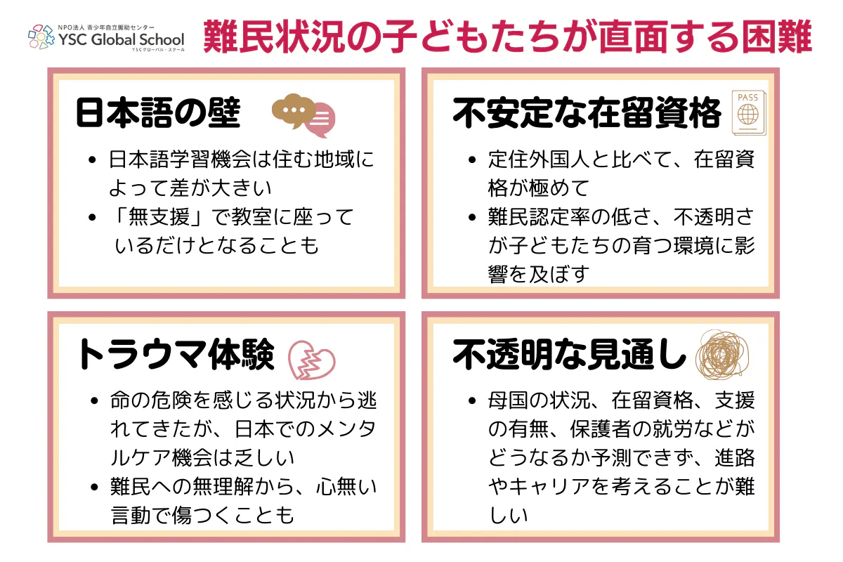 出身国での紛争や命の危険から逃れてきた子どもたちは、トラウマ(心的外傷)になる出来事を経験しています。日本国内で母語でのメンタルケアを受けられず、様々な不安や思いをなかなか吐き出せない状況です。また、難民や難民の状況についての理解が乏しい環境で、マイクロアグレッション(悪意のない差別的言動)やいじめにさらされることもあります。