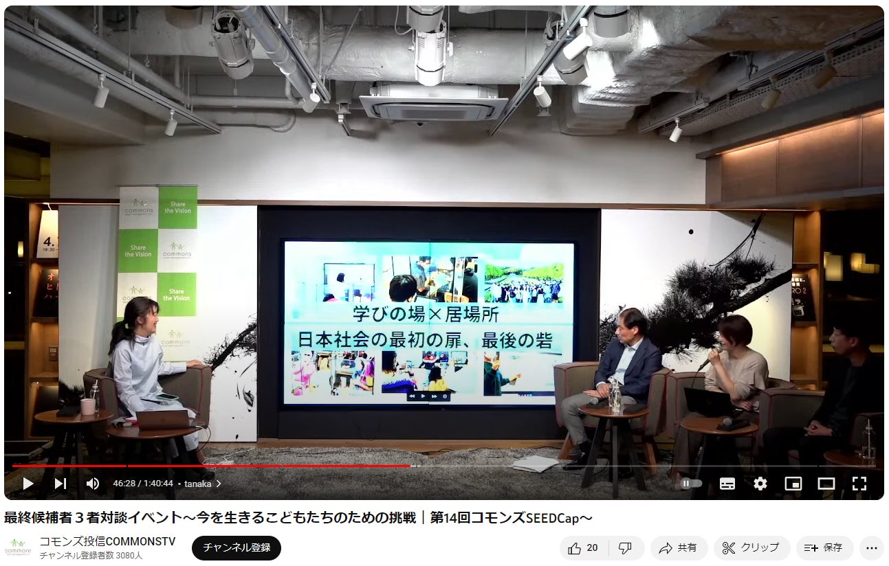 (YSCグローバル・スクールは、第14回「コモンズ社会起業家フォーラム」へ田中が登壇し、コモンズSEEDCap応援先最終候補の1つとして選出されており、1年間、コモンズ様より様々な形で応援していただいています!)