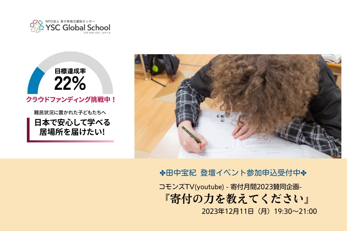 2023年12月11日(月)19時30分~、コモンズ投信様による「コモンズTV (YouTube)」にYSCグローバル・スクールの田中宝紀が登壇。子どもたちが抱える社会課題やクラウドファンディングについてお伝えします。