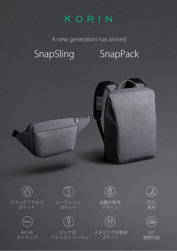 世界でご好評いただいているKorinDesigの最新作、「SnapPackシリーズ」です。
