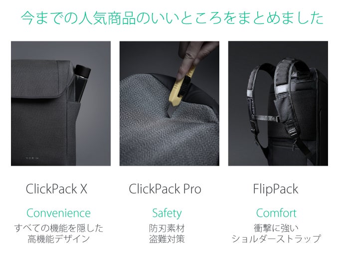 上の動画のように身近で起こる盗難に着目した【安全安心を担ぐ防犯対策済】バックパックでご好評頂いているCLICKPACKおよびCLICKPACK JOY、2017年度グッドデザイン賞を獲得したCLICKPACK Proをリリースしています。