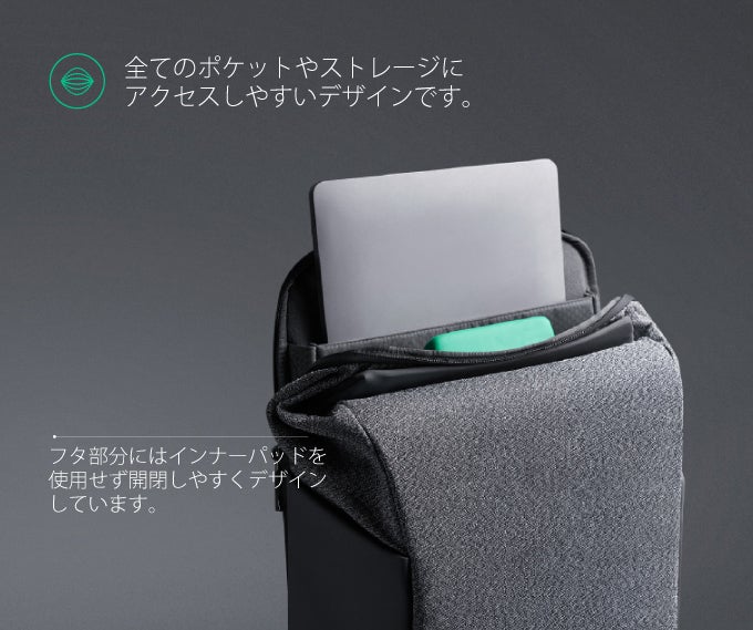 ①コリンデザインのコンセプトは「安心感を持って使っていただくこと」です。コリンデザインの製品は、“Click anti-theft"盗難防止システムや、"Easy Charging機能、"、人間工学に基づいて設計されたストレージシステム、電子機器の保護など、ガジェットやパソコンなどのモバイル機器を常に携帯することをイメージして、製品をリリースしています。