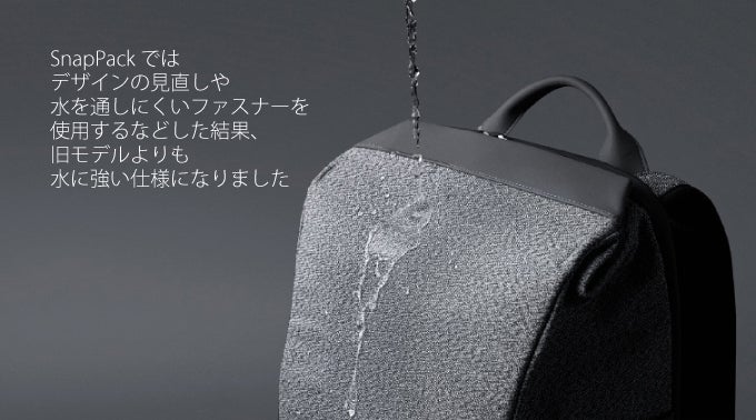 【安全安心を担ぐ防犯対策バックパック】という基本コンセプトはそのままにClickPack、FlexPack、HiPack、FlipPack、ClickPack Xなど今まで大変ご好評頂きました。その人気商品のいいところをSnapPackにまとめたデザインとなっております。