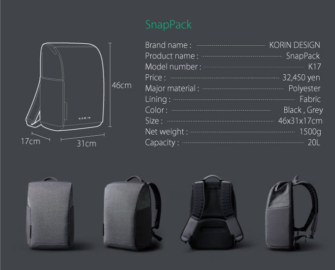 弊社はKorin Designの正規販売店でございます。類似品などにご注意ください。今回のSnapPackは海外のクラウドファンディングでも好評で、ユニセックスなデザインと、高機能が合わさった使いやすいバッグです。性別や年齢など問わず、様々なお客様にKorinDesignを知っていただけるきっかけになればと思いプロジェクトを立ち上げました。