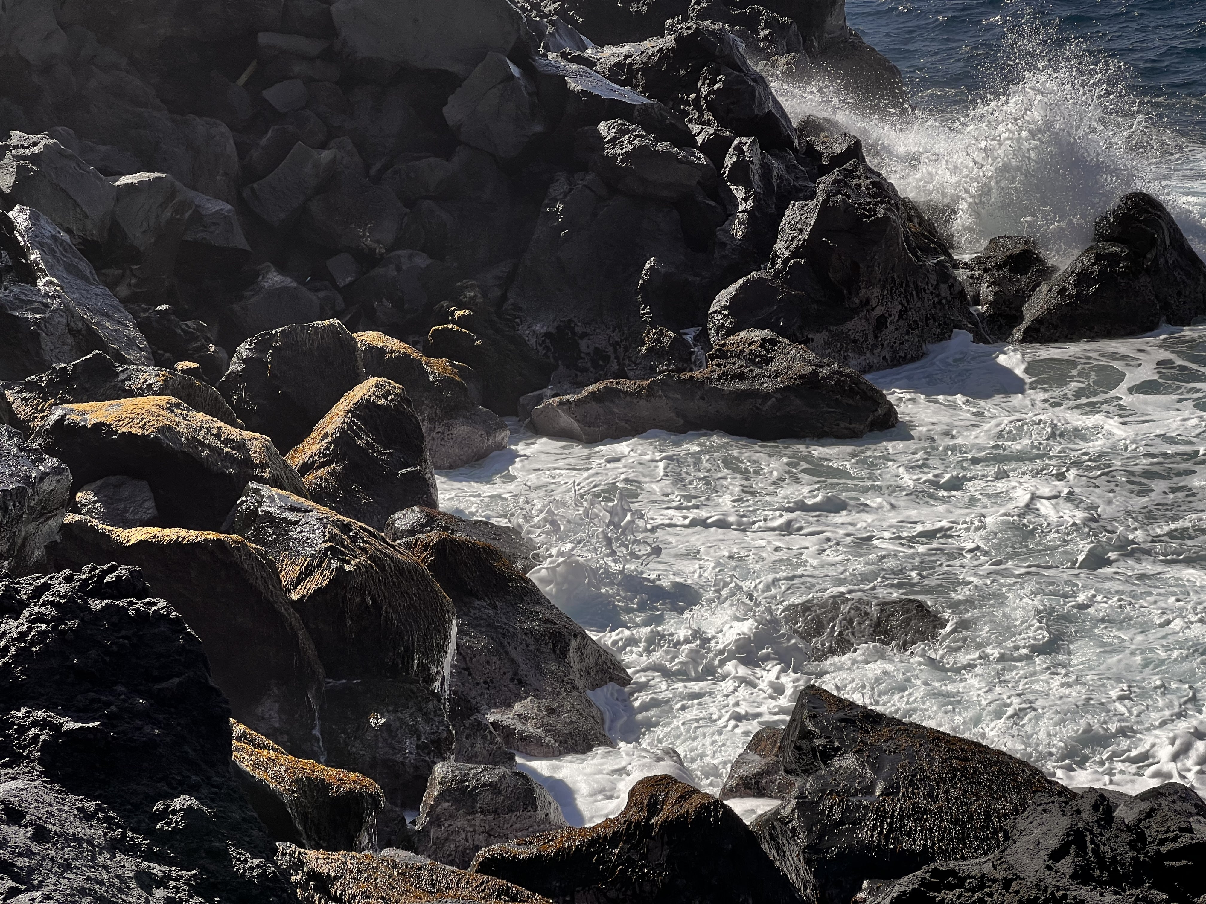 この様な、岩場で採ります。波打ち際の岩が色が変わっている所が岩海苔が出来ている所です。なので、とても危険で私達も必ず一人では作業には行きません。仲間と一緒に行って、お互いの安全を確認しながら作業をしています。また、心掛けているのは、海に背を向けない事です。背を向けると波の状態が解らず波に落とされてしまいます。それは、死に直結してしまうので、常に海の状態を見ながらの作業となり、波の状態では何度もその場から逃げては戻っての繰り返しで作業をしています。また、私達は、落下しても大丈夫の様に必ずウエットスーツを着用して作業をしています。実際に何度か滑って落ちたり、波をかぶってしまったり、泳いで岩場を移動したりして岩海苔漁をしているので、ウエットスーツは必需品でもあります。八丈島は、ほとんどが岩礁で人が歩いていけない所もあり、そういう時に、カヌーを使って行って漁を行います。