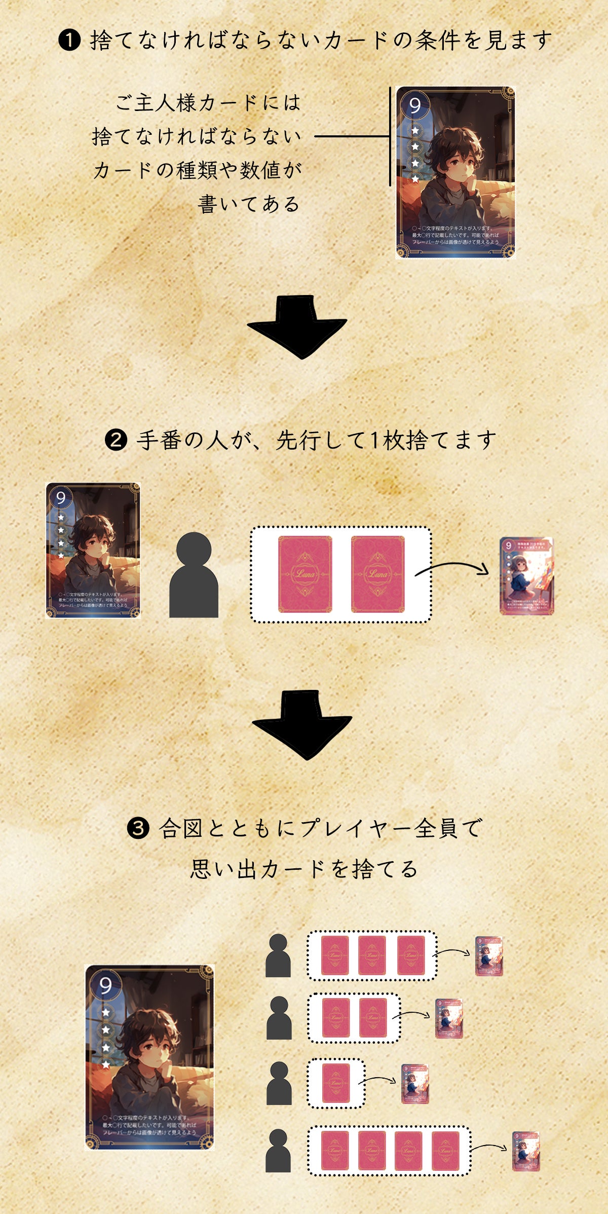 プレイヤーたちは一切相談しないで、捨てる思い出カードを決めます。