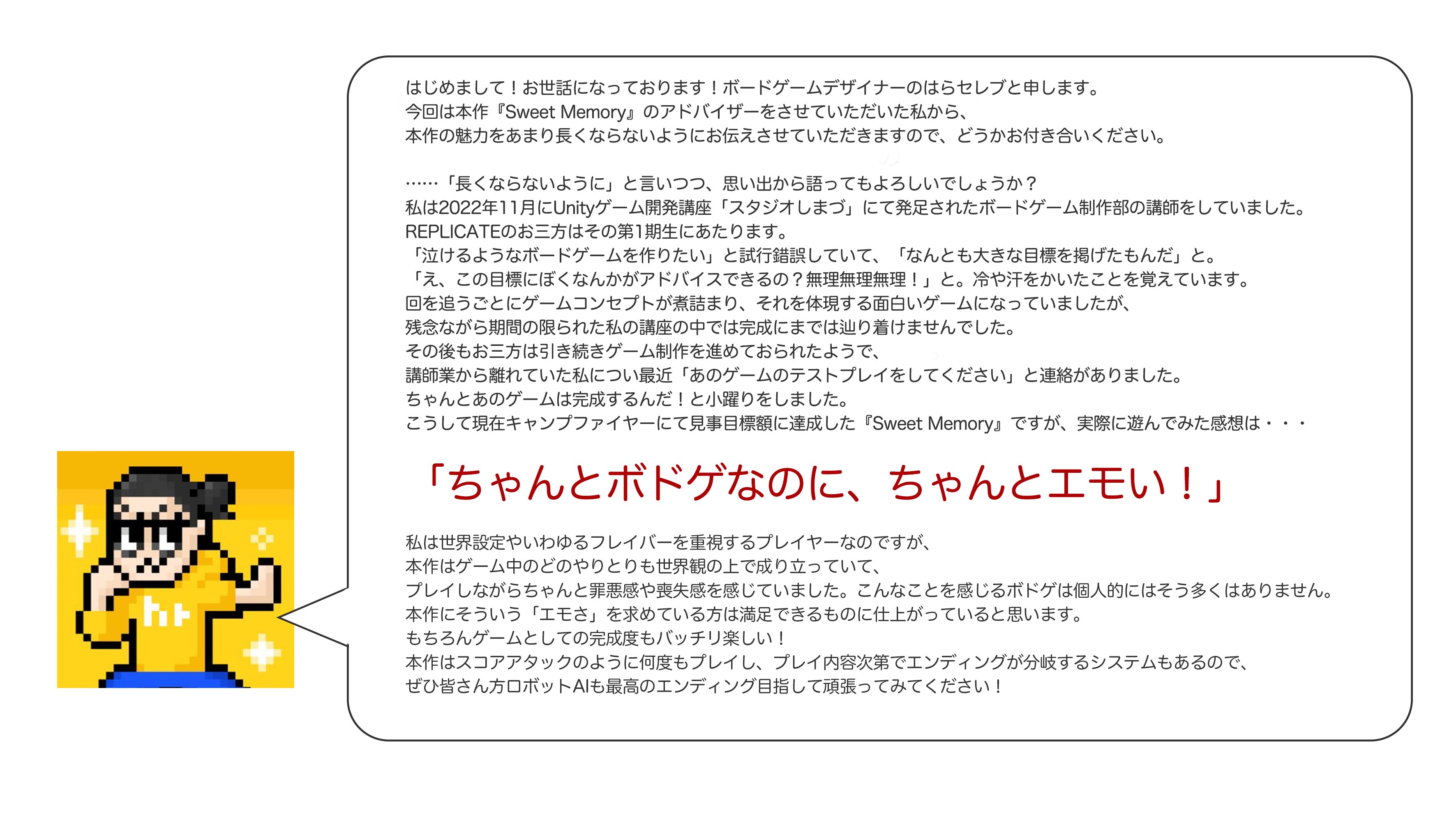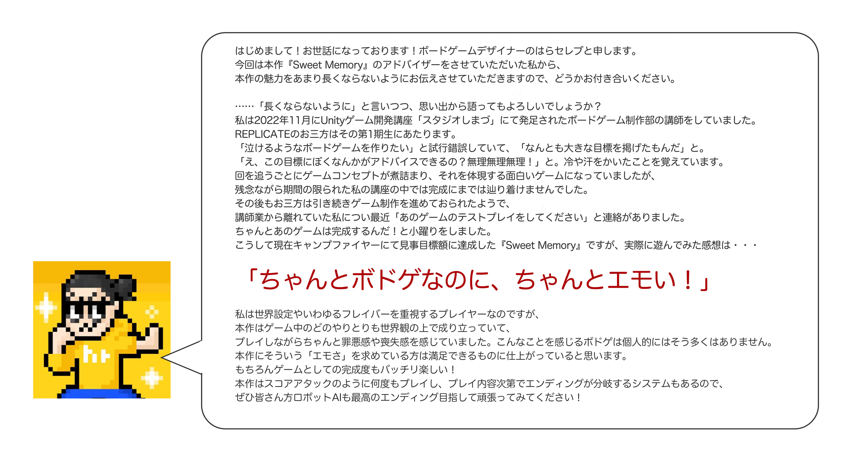 はらセレブさんは、ボードゲーム界隈では有名なクリエイターですが、本作のアドバイザーとしてもお力を貸して頂きました。