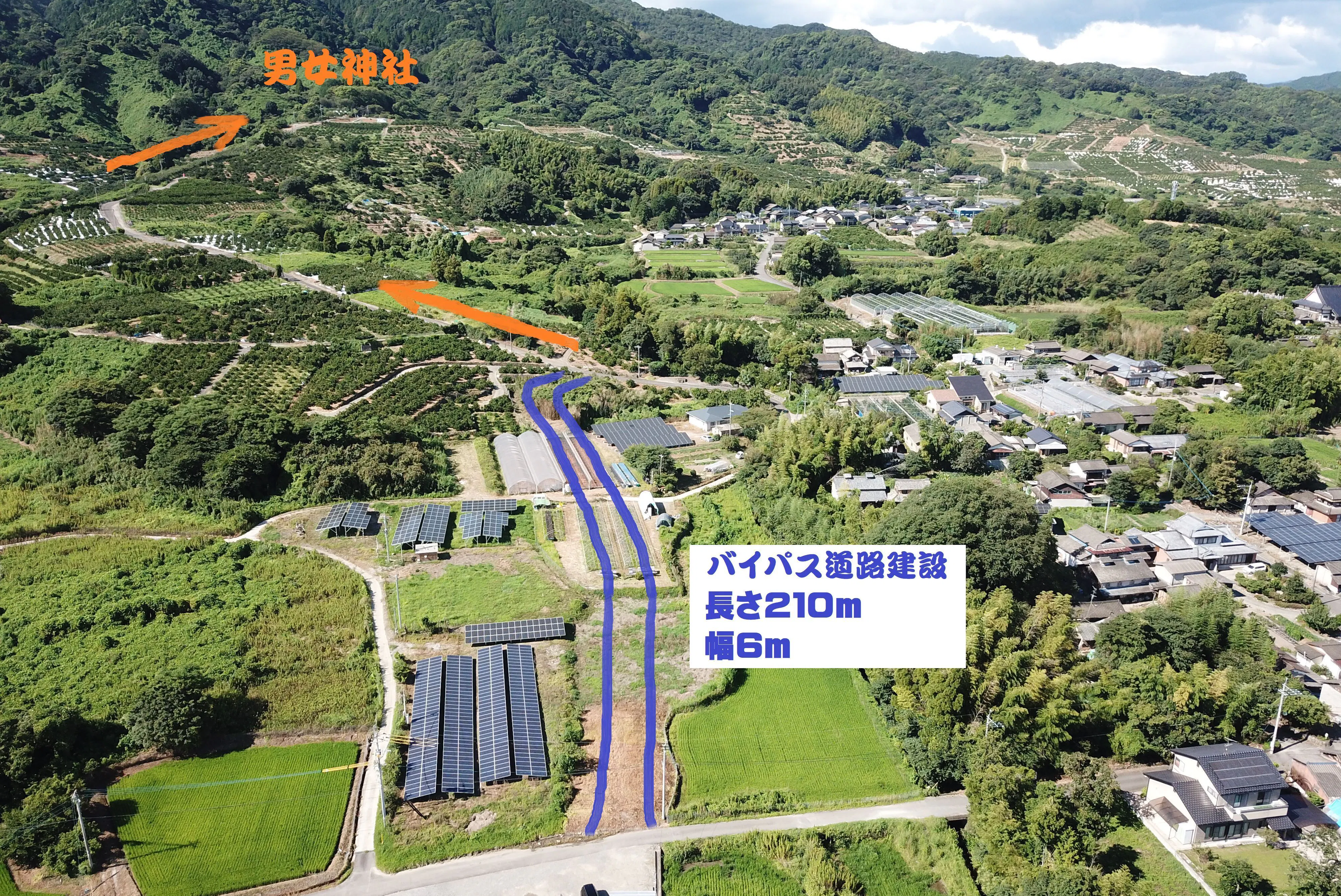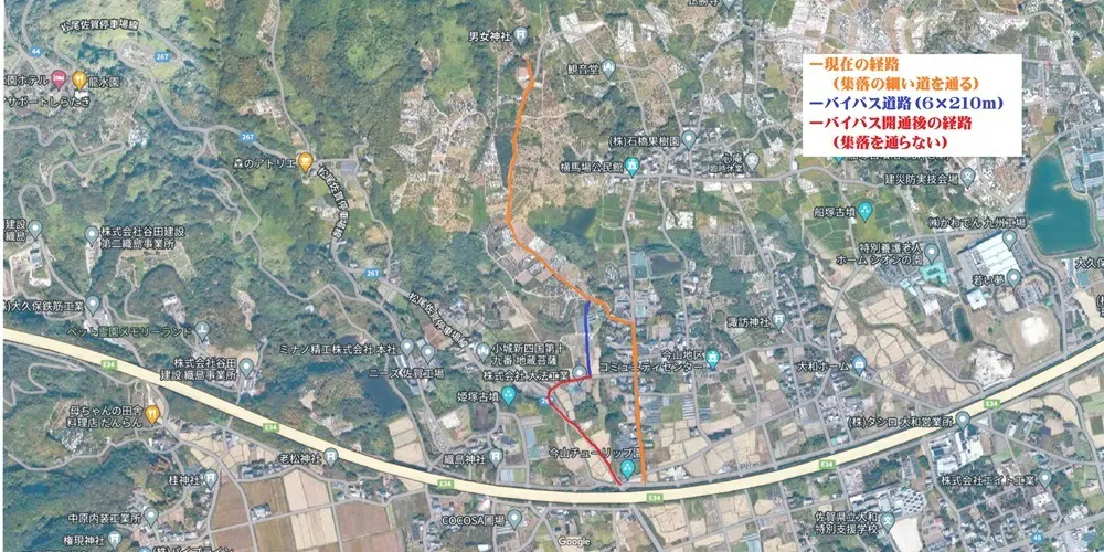 バイパス道路が完成すれば、集落をまったく通らず、県道から直接男女神社へ行くことができるようになります。