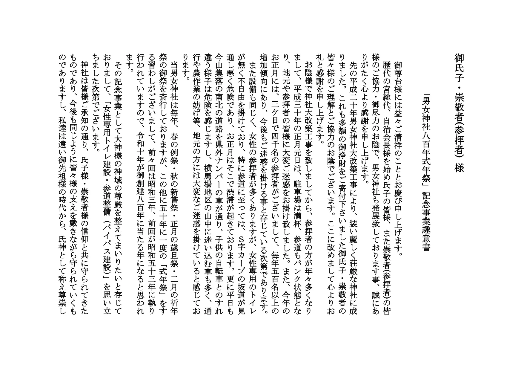 ②男女神社800年式年祭芳名板にお名前と奉賛金額を掲載(リターン金額が2万円以上の方はすべて掲載、匿名可能)