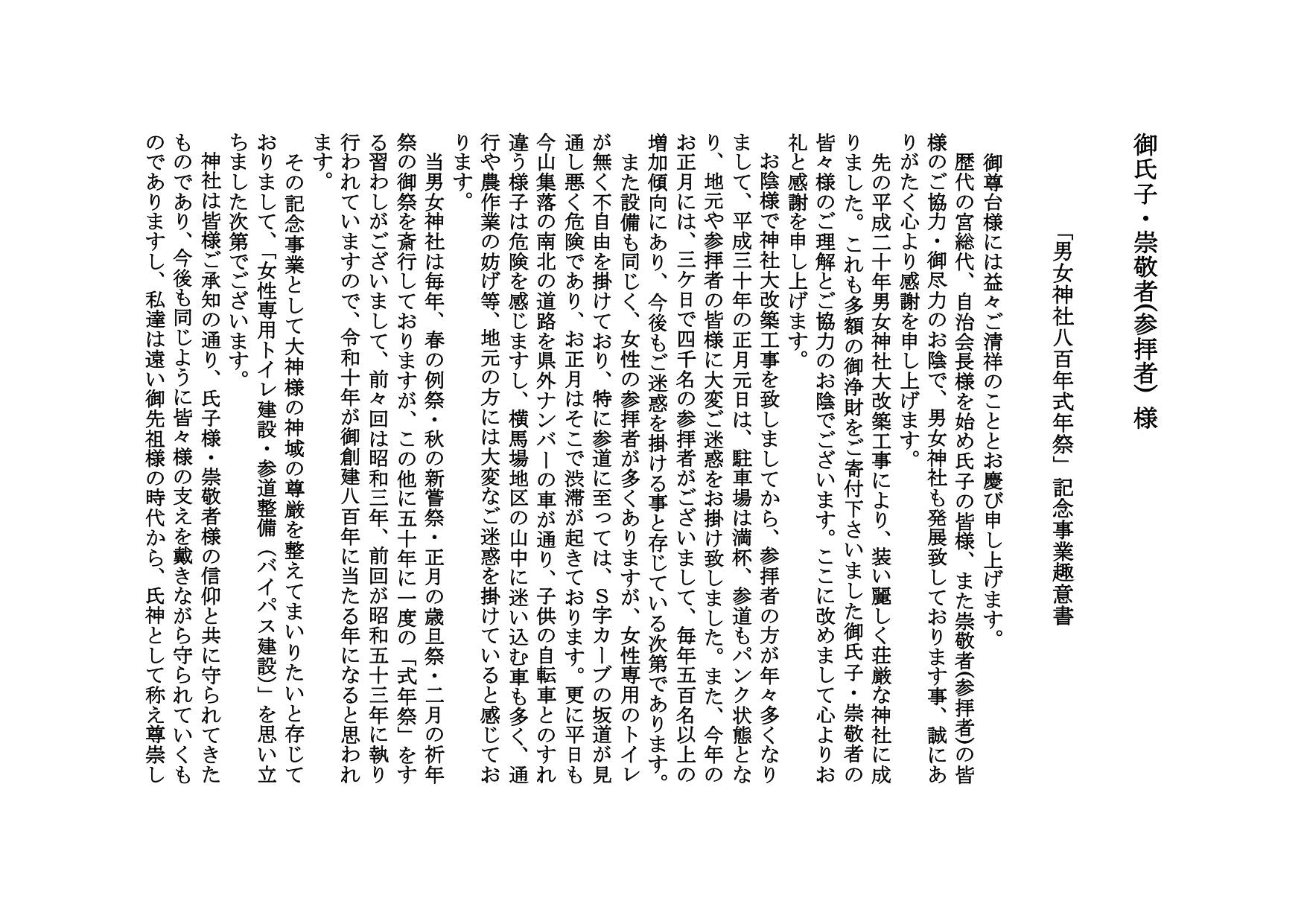 ②男女神社800年式年祭芳名板にお名前と奉賛金額を掲載(リターン金額が2万円以上の方はすべて掲載、匿名可能)