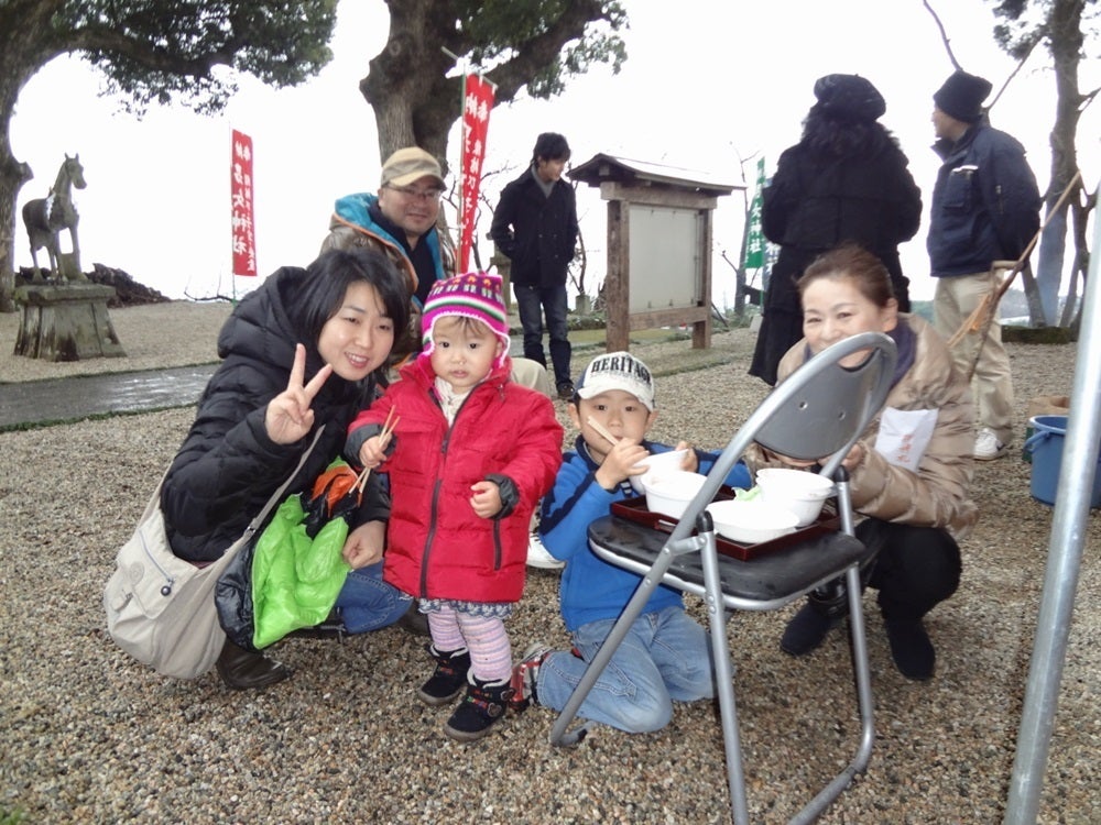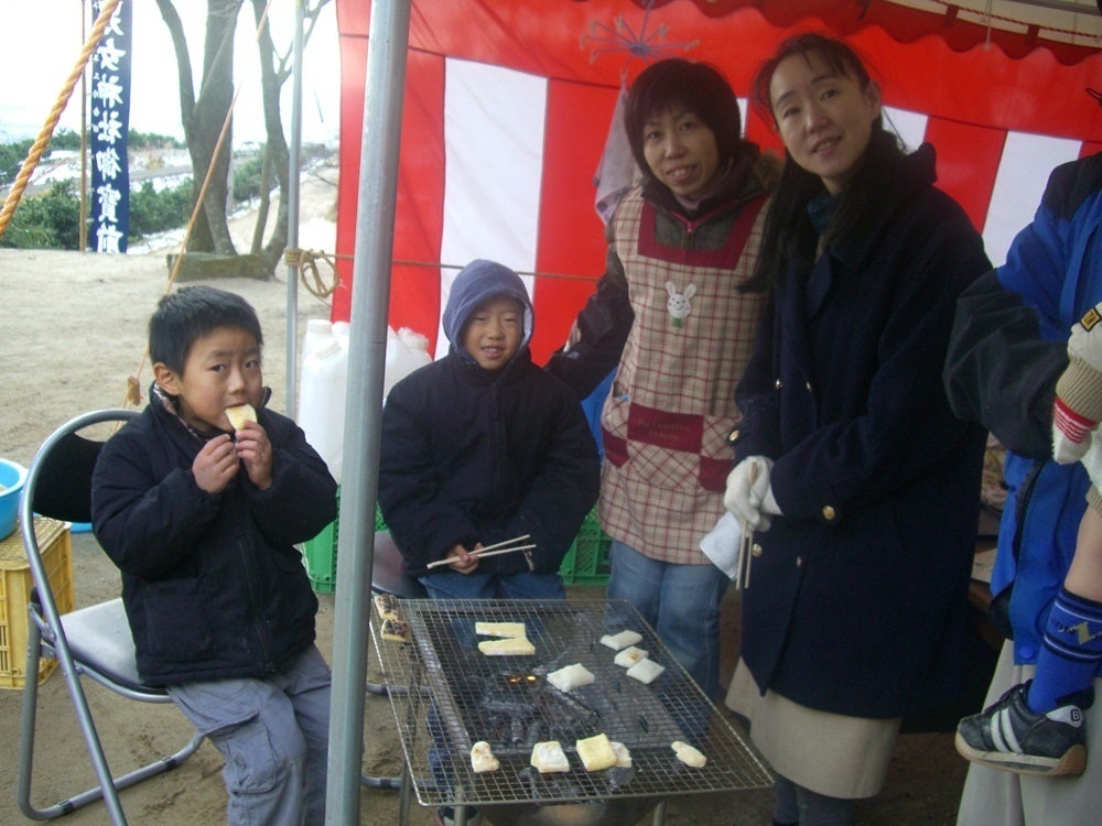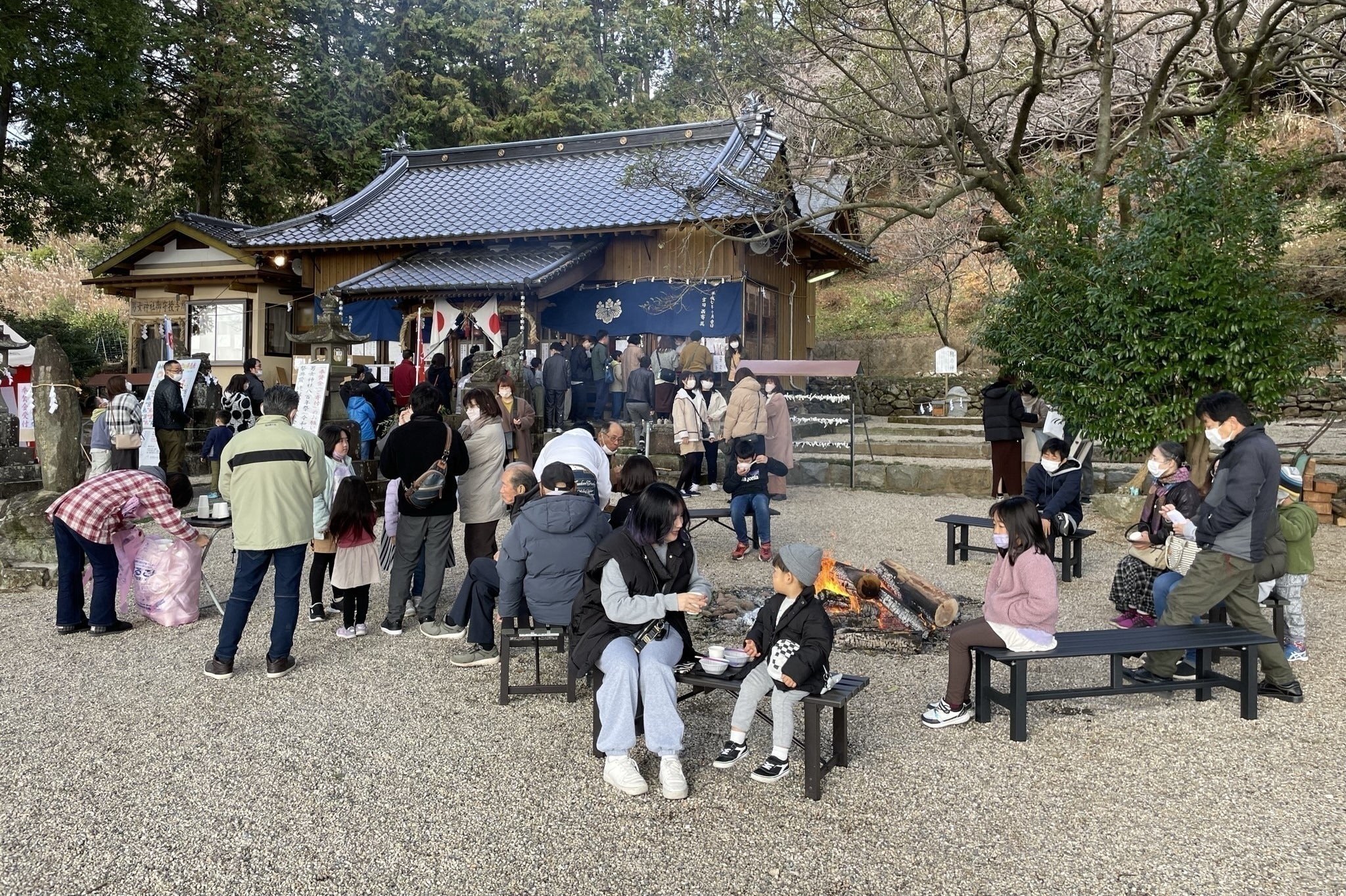 お餅は地物の農家さんが作られたもので、年末に100キロの餅をつき、お正月に神社の境内で炭火で焼いて出しています。