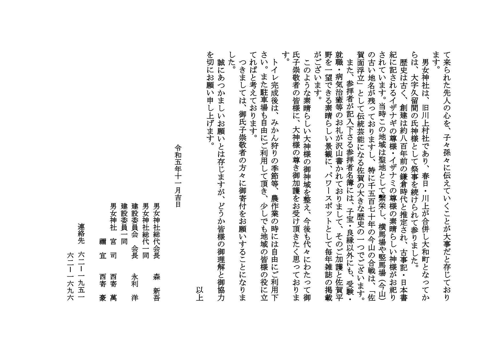 ②男女神社800年式年祭芳名板にお名前と奉賛金額を掲載(リターン金額が2万円以上の方はすべて掲載、匿名可能)