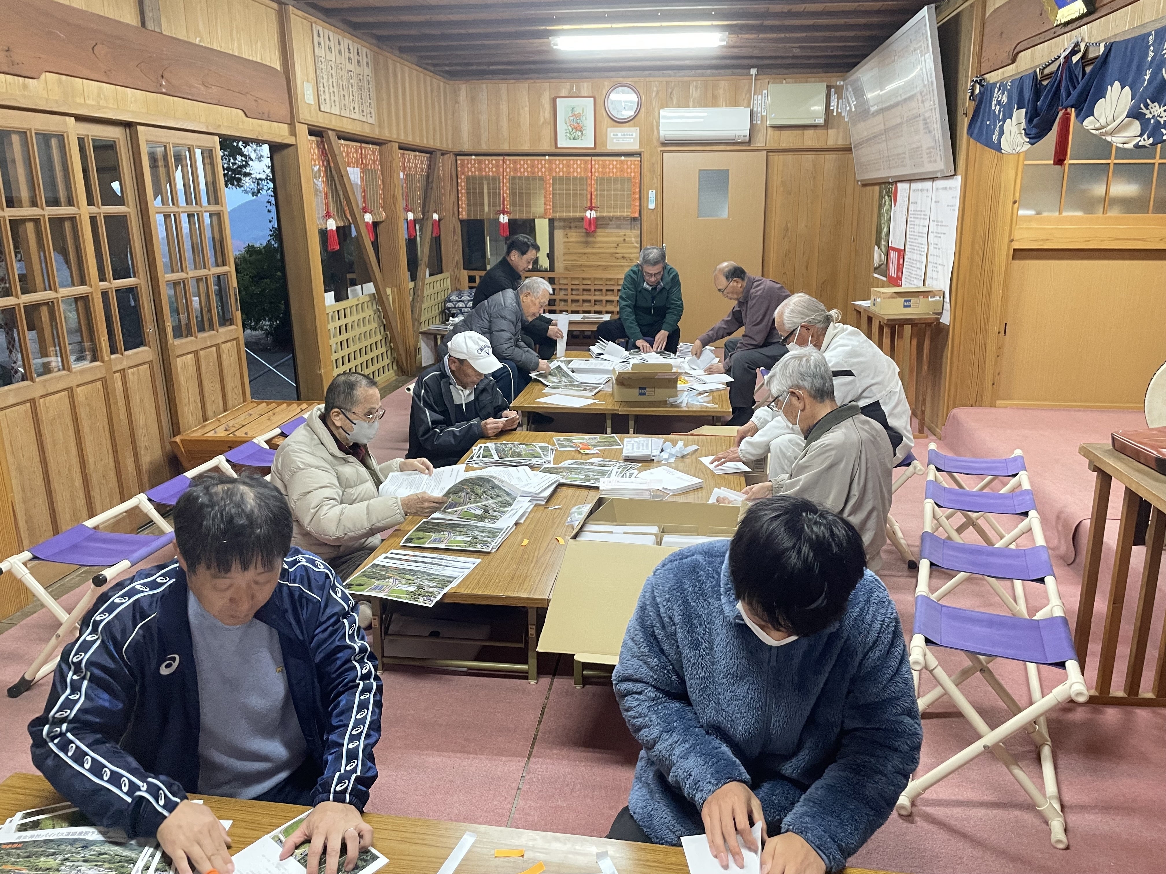 建設委員・神社総代・神職の奉賛金(支援金)ご案内発送作業の様子 バイパス道路建設は、ルートの検討・検証、地権者との交渉、測量、見積りまで終え、現在は地域の皆様へ説明会を開催、令和6年3月に、バイパス建設予定地の土地の購入を行います。