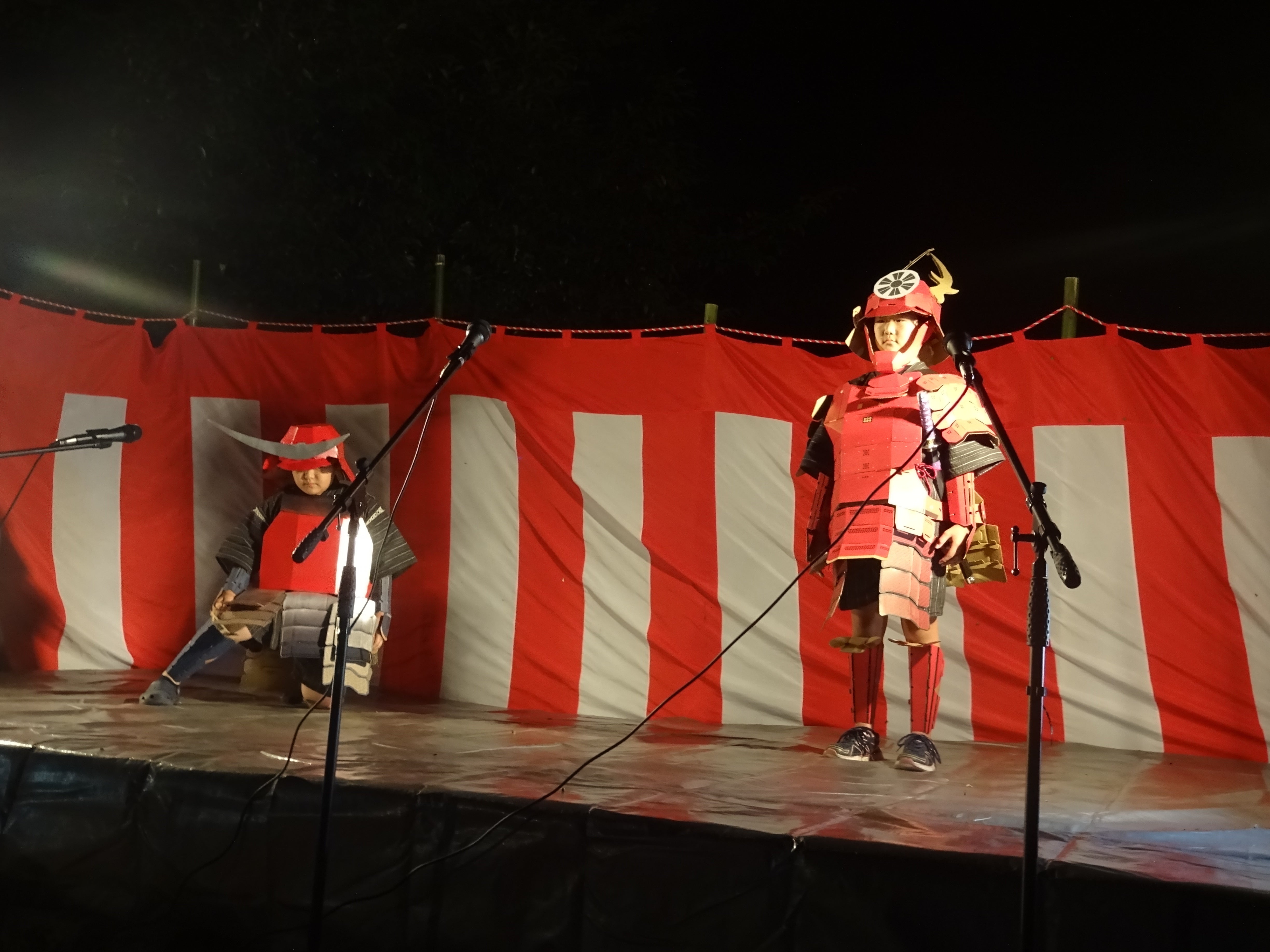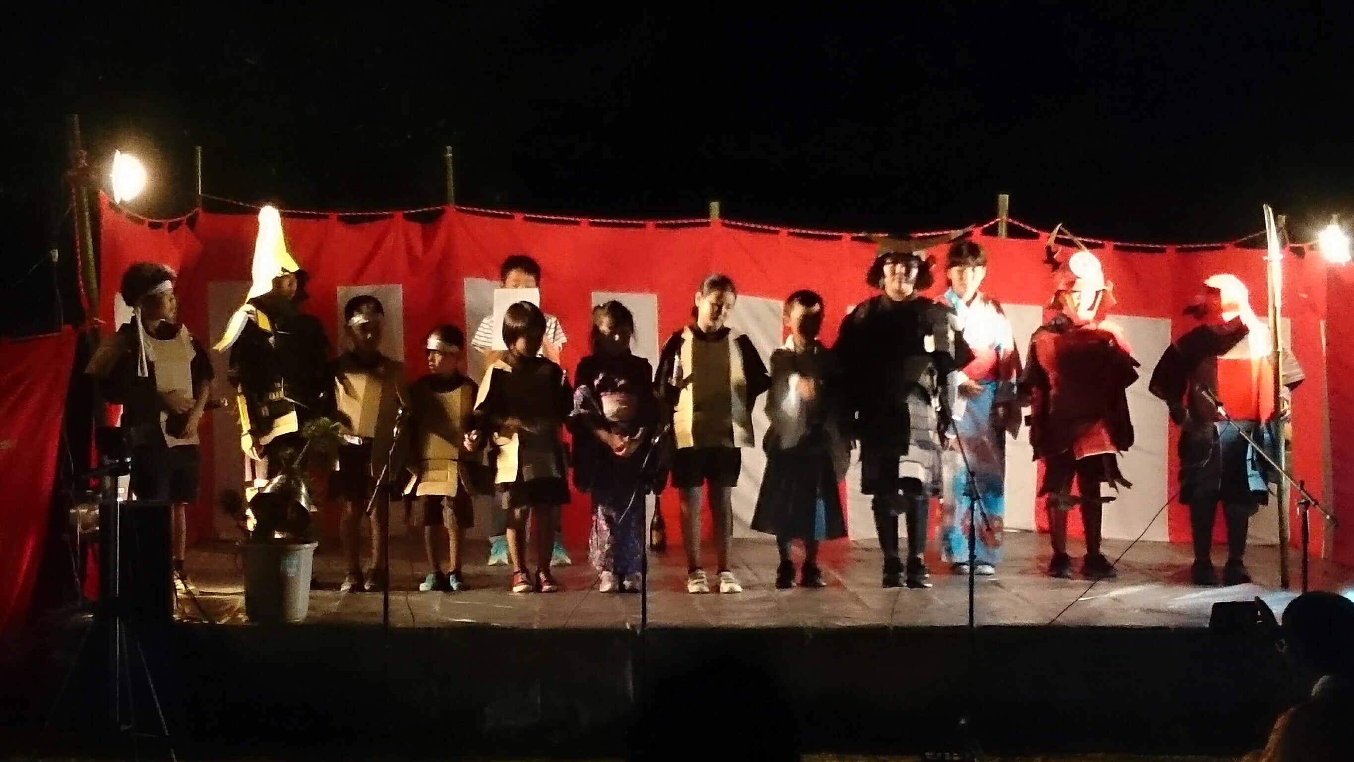 地元の小学生を集め、今山の合戦劇を行いました。地元の小学生、今山の合戦劇(男女神社於いて)