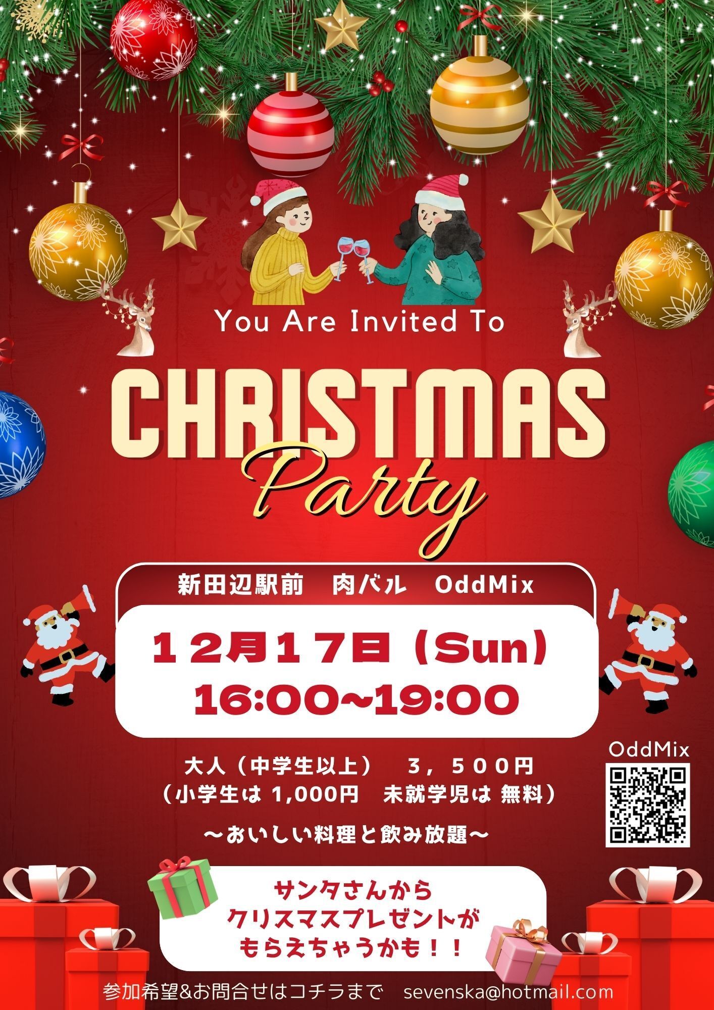 クリスマスパーティーは12月17日(日)に、京田辺市の肉バル「OddMix」さんで開催予定です。