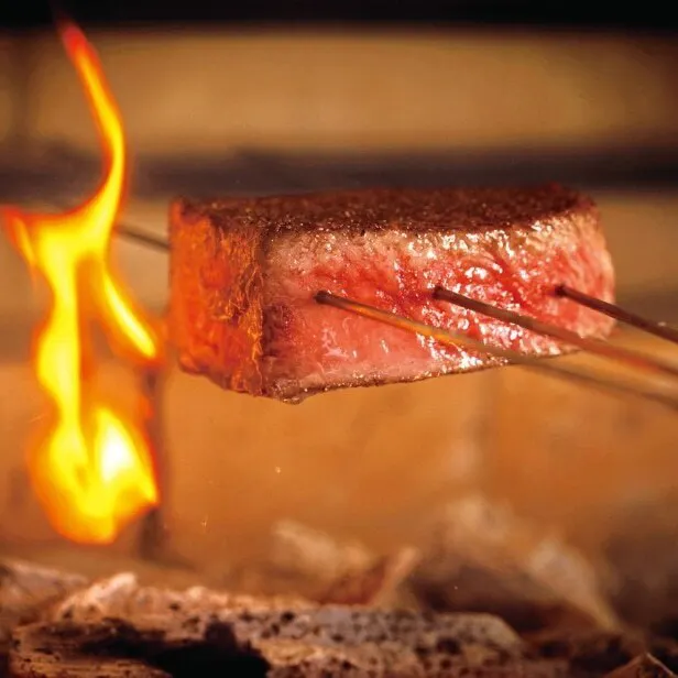 メニューについて、契約農家から直送される有機野菜を使った前菜や手打ちパスタ、黒門卸売市場から水揚げされた魚介類、そして当店看板メニューの最高品質A5(bms12)神戸牛を始め黒毛和牛のヘレやサーロイン等のお肉を紀州の備長炭で旨味を閉じ込めステーキにして提供致します。