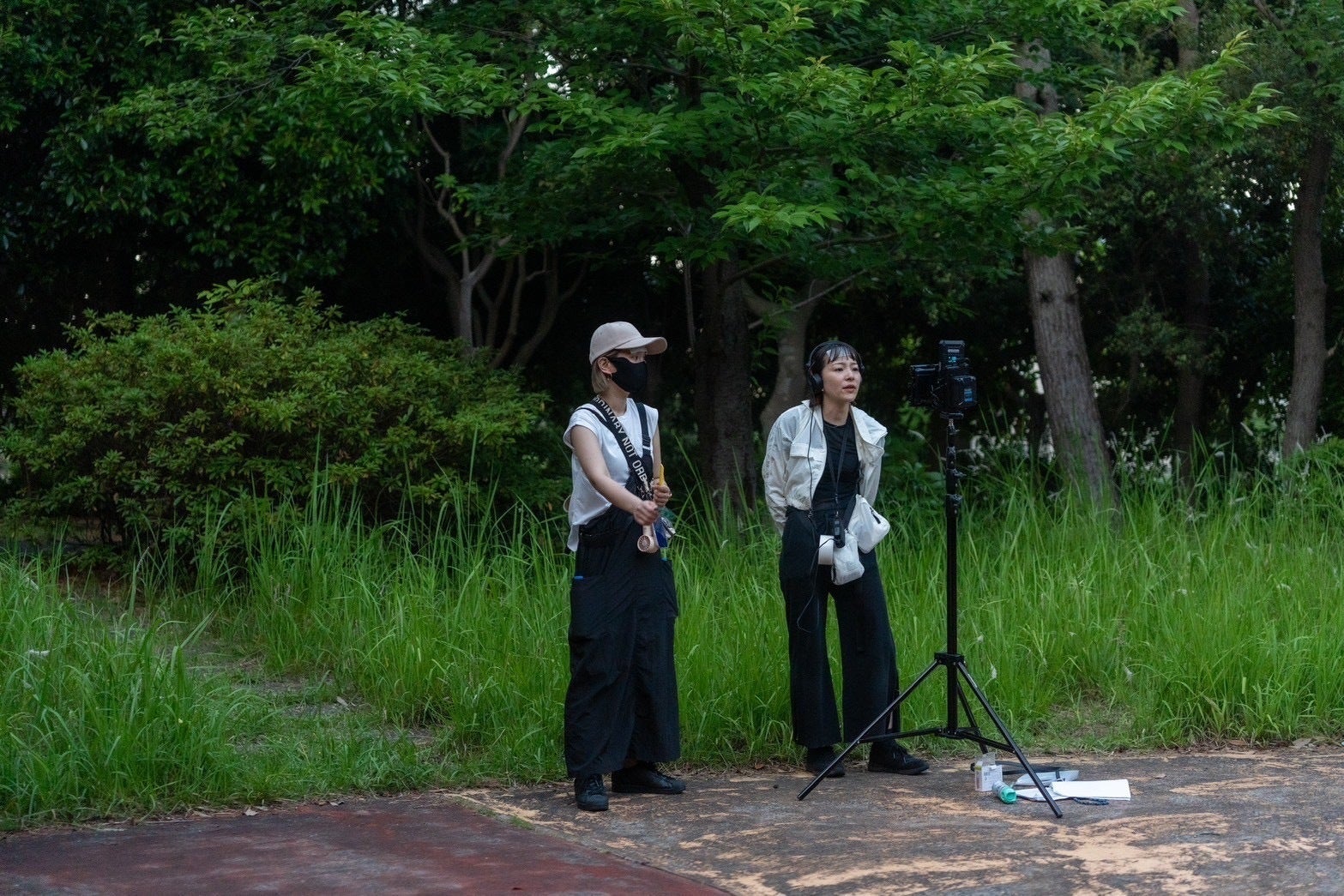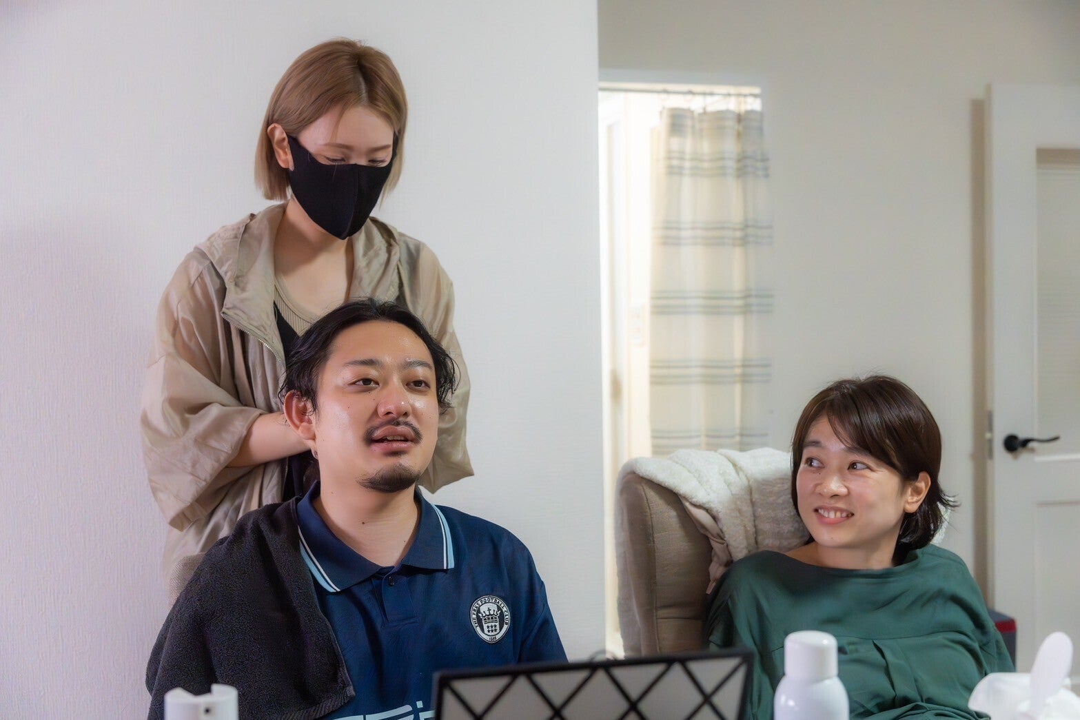 ↑ヘアメイクの成美さんと共に冷えピタをおでこに貼りながらモニターを覗いている図