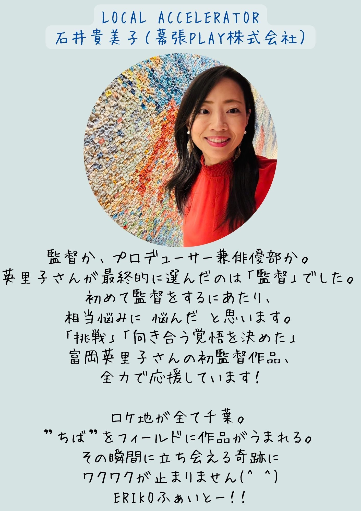 誰かに我慢をさせるとわかっているのに自分がやりたい企画をやりたい形のまま通すことはできない…やりたい形を変容させて実現していくべきか…と考えていた時、このクラウドファンディングを伴走サポートしてくださっている幕張PLAY(株)さんから「富岡さんが監督するっていうのは、どうですか?」とご提案いただきました。