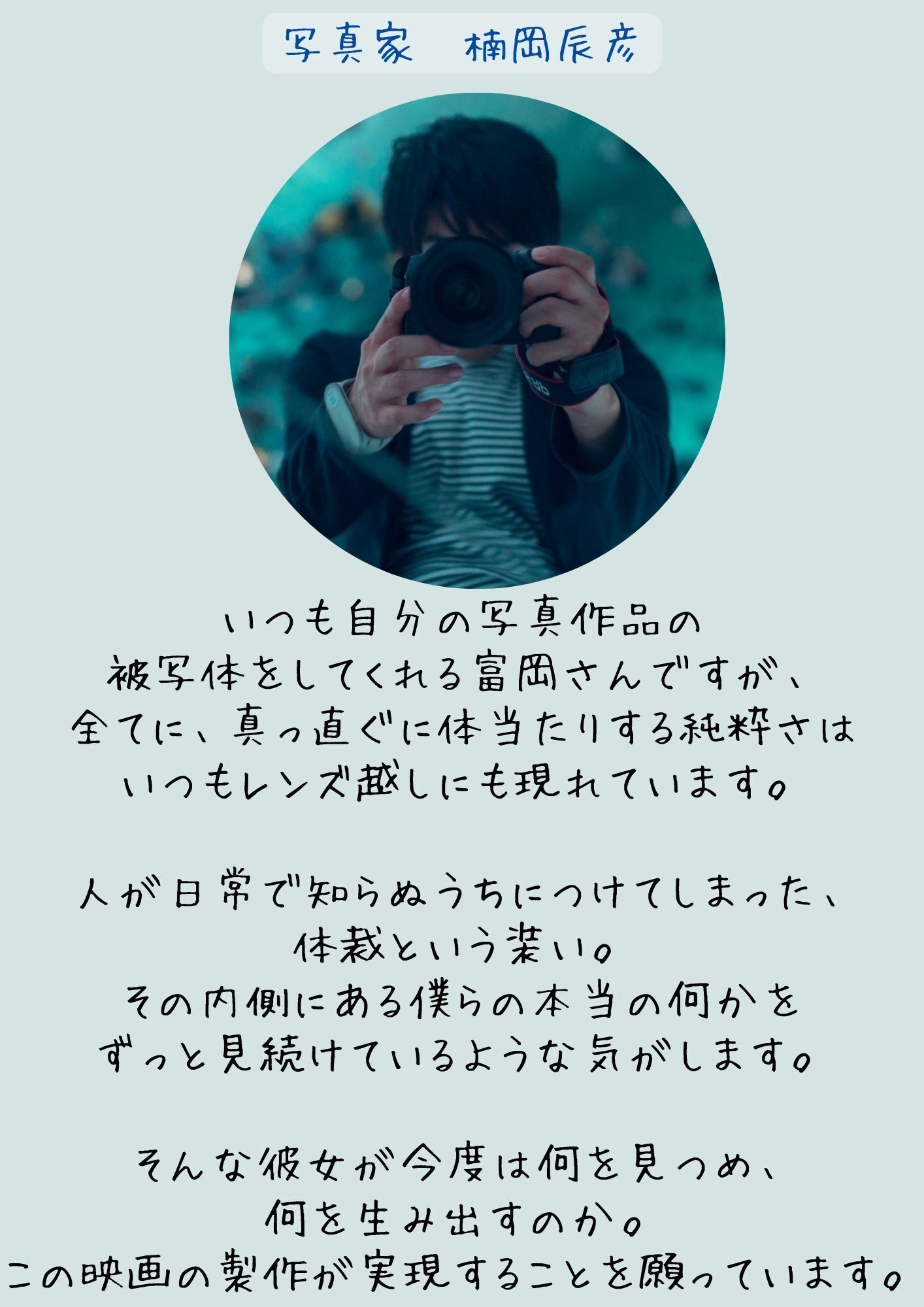 出演依頼をしたい俳優に「もし私が監督をやると言ったら、出演してくれますか?」と聞い時に「もちろん嬉しいです。」と返して貰えたことも、大きな決定打だったと思います。(ありがとう…涙)