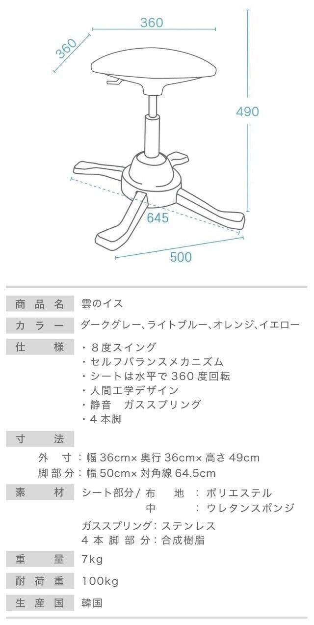A3.その秘密はバランスボールスタイル。雲のイスはバランスボールに座っているように自然と正しい姿勢に整えることができ、背もたれがない状態でも、腰をそっと支え姿勢を安定させます。無理せず自然で良い姿勢をキープします。バランスボールのデメリットを改善し、コンパクトでお洒落なデザインにしたのが「雲のイス」なのです。