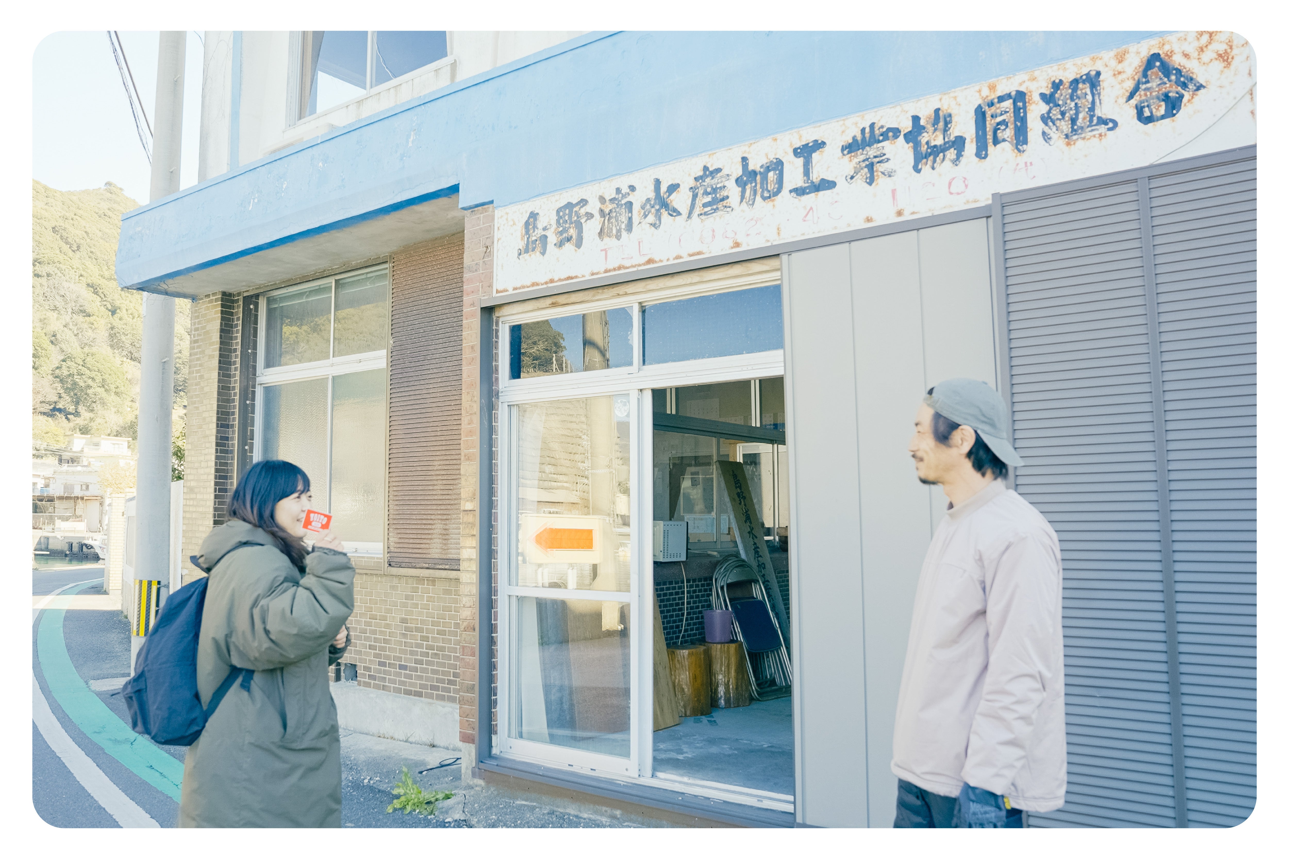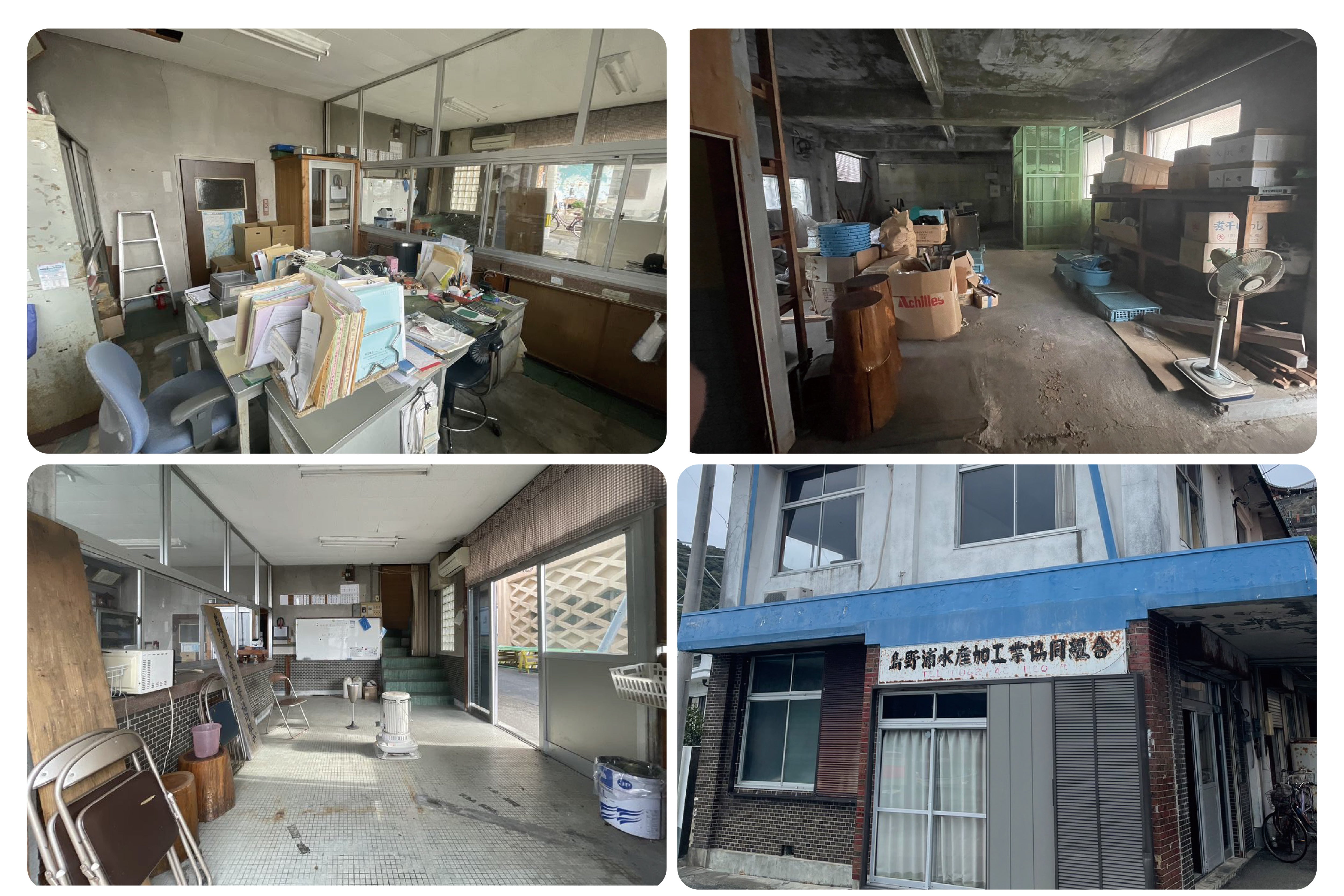 島野浦水産加工業共同組合とは、水産加工事業者の事務作業や梱包用資材の取り扱いを行っていた組合であり、長年に渡り島の水産業を支えてきた大切な組織です。しかしながら、業務の煩雑化や人材不足の影響から、2022年に解散、現在は建物だけが残っている状況です。約50年前に建設された建物は今でも島の中心地に堂々と建っています。