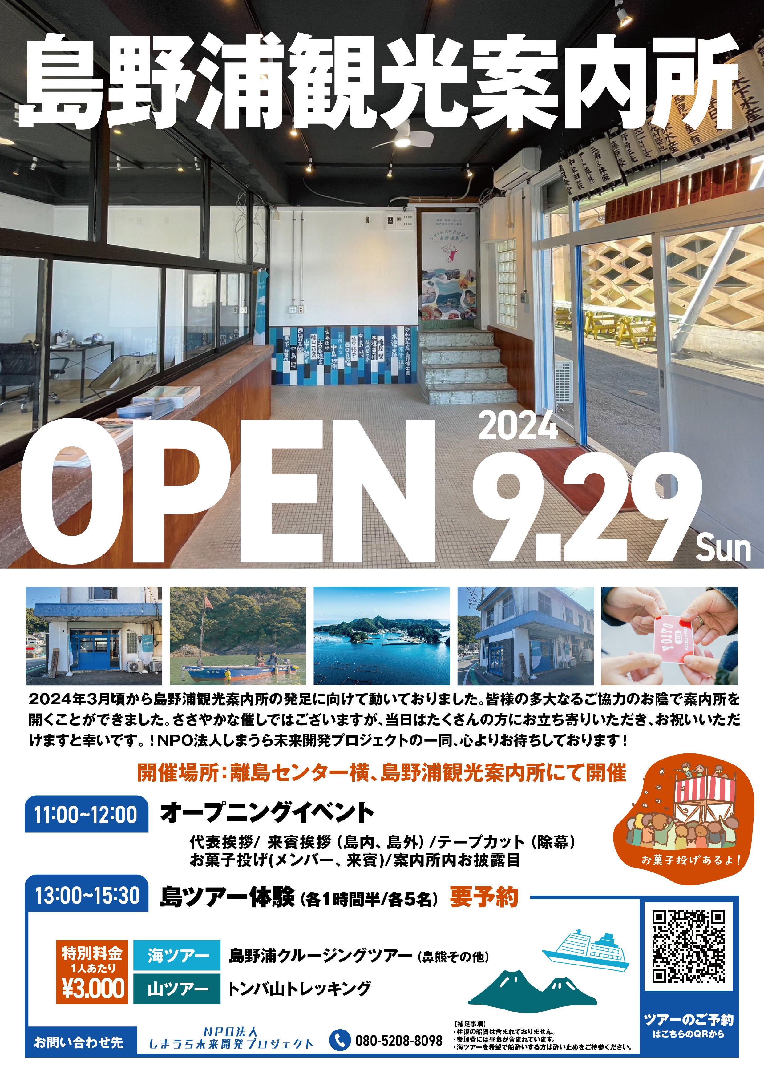 2024/09/19 18:00こんにちはNPO法人しまうら未来開発プロジェクトです!本日のおしらせは!!いよいよ!島野浦観光案内所オープニングイベントを開催いたします!☆イベント詳細☆・日時:2024年9月29日(日)11:00〜15:50・場所:島野浦観光案内所(島野浦中央港近く)・催し: ・11:00〜12:00 オープニングイベント (代表挨拶、来賓挨拶、除幕式、お菓子投げ等) ・13:00〜15:30 島観光体験ツアー【海ツアーと山ツアー】 (各1時間半/定員数各5名) →海ツアー:島野浦島半周クルージング →山ツアー:とんば山トレッキング・参加費:各ツアー1名/3,000円 ※オープニングイベントのみの特別料金 ※豪華な昼食付き☆ツアーお申し込み方法下記URLよりお申し込みをお願いいたします!https://docs.google.com/forms/d/e/1FAIpQLSfvec9GNZOj73Qna3xvmgNUHLq432Y6DbPBxviD6P8CQCDiuA/viewform☆お願い・参加費は当日現金でのお支払いとなります。・ツアー参加希望で船酔いされる方は酔い止めをご持参ください。・島までの交通費はご自身でご負担をお願いいたします。島野浦観光案内所は、地域の魅力を発信し、観光客の皆様に快適な滞在を提供する拠点として、地域活性化に貢献して参ります!イベント当日は、島観光体験ツアーはもちろん、島民も参加するお菓子投げや豪華な昼食も準備しています!我々にとってとても大切な日になると考えています!ぜひ多くの皆さまと一緒に、これから始まる新しいチャレンジをスタートできると幸いです!NPOメンバー一同、ご参加を心よりお待ちしております! もっと見る
